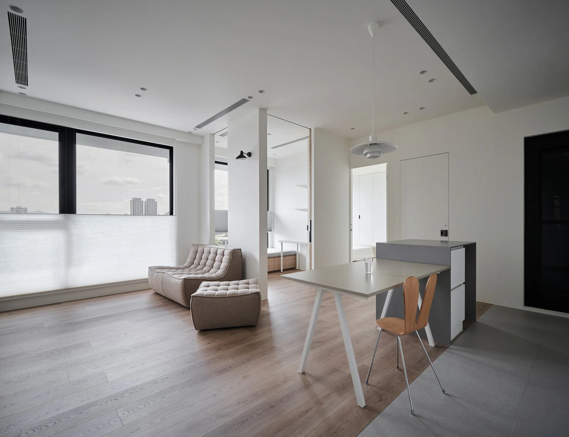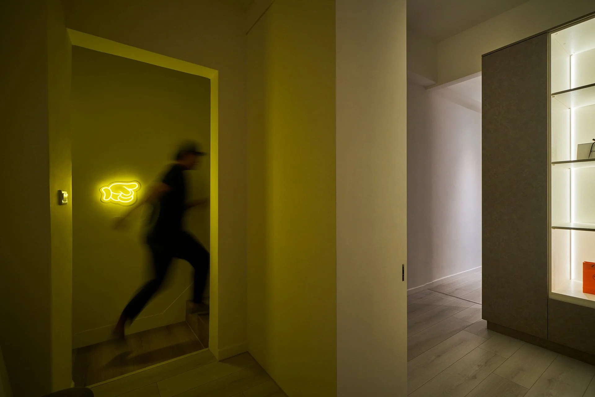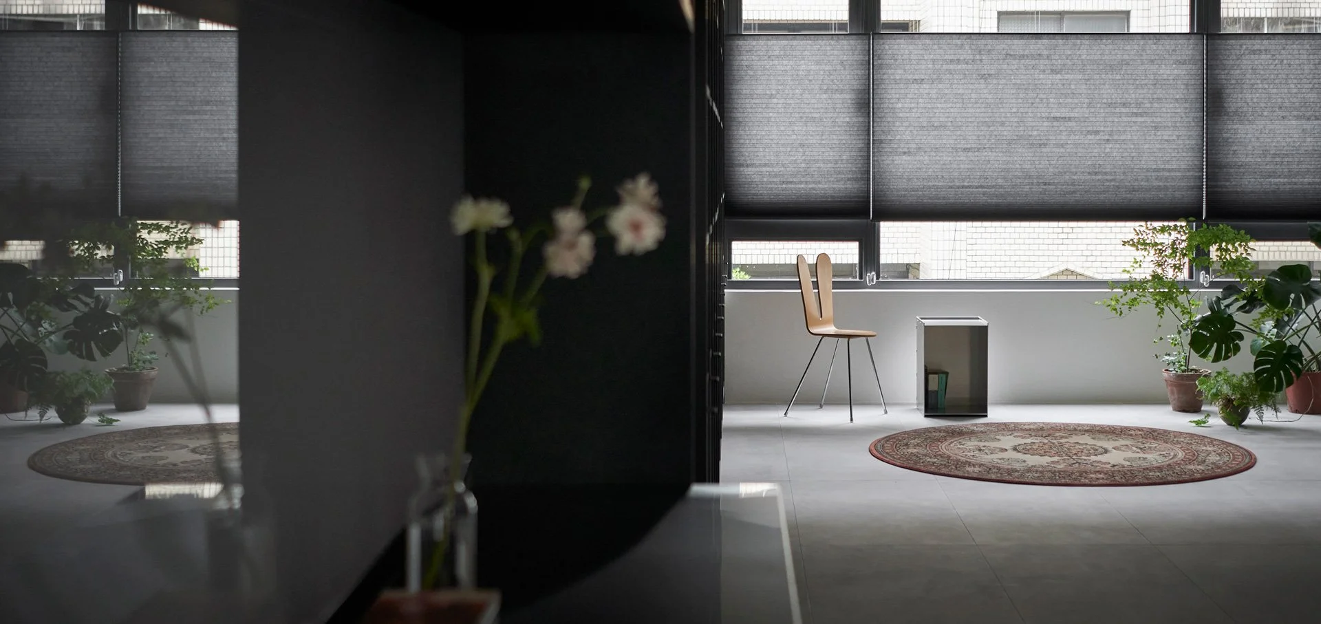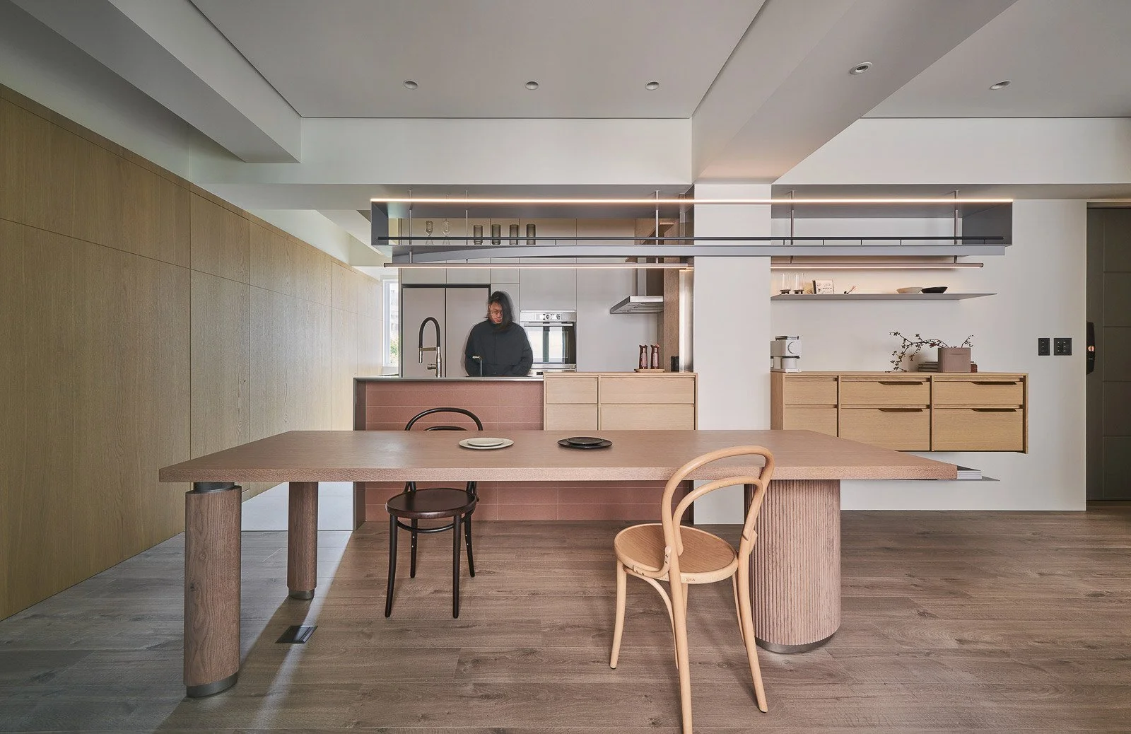 他精準地解構空間,每一次構圖皆沿著軸線展開,進行切割、對位與重組。在營造氛圍、進行感性敘事的同時,他亦追求清晰秩序的可視性。牆面間的對稱、轉角的對齊、深度與前後景的配置,皆化為空間語法的可讀線索。