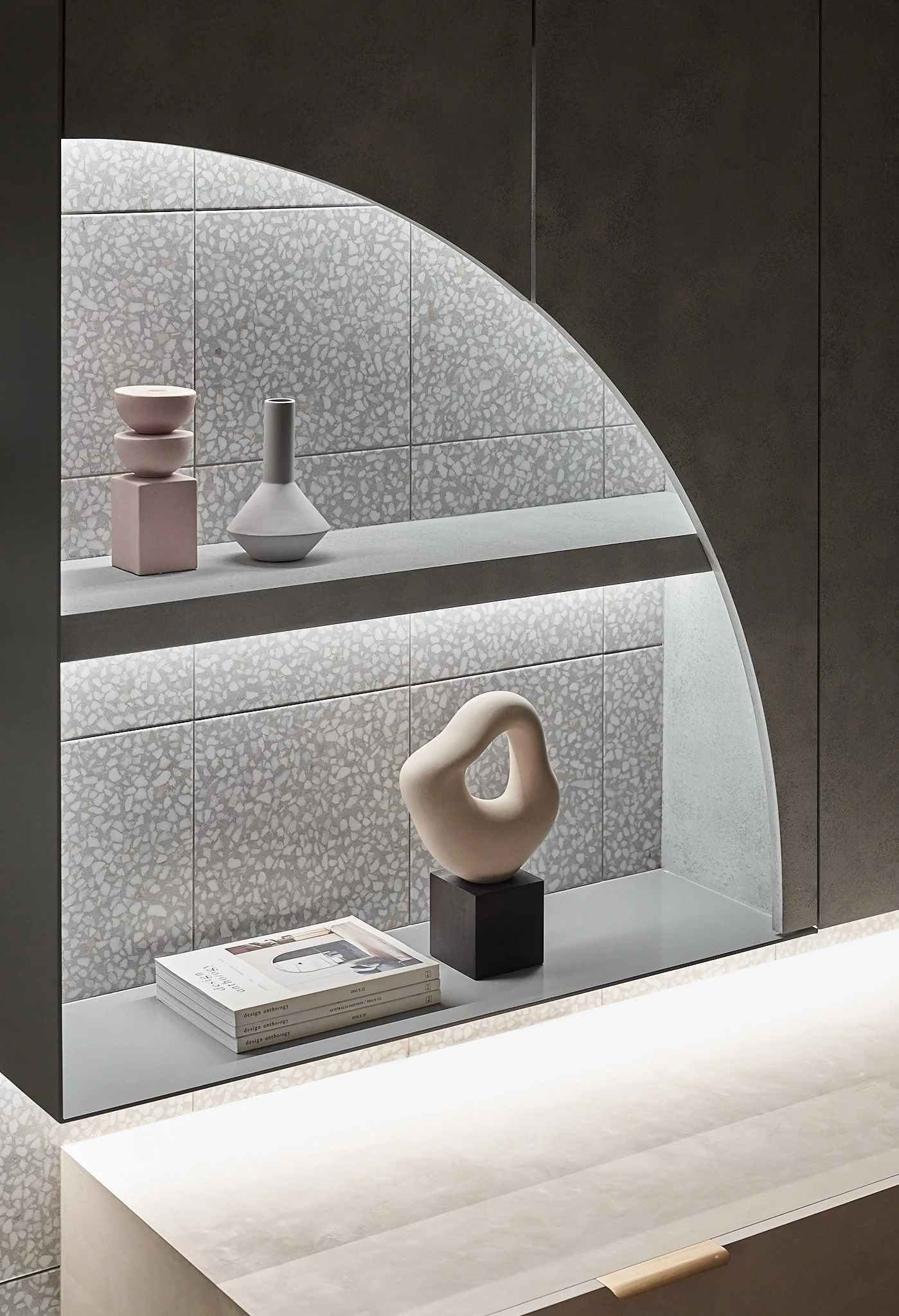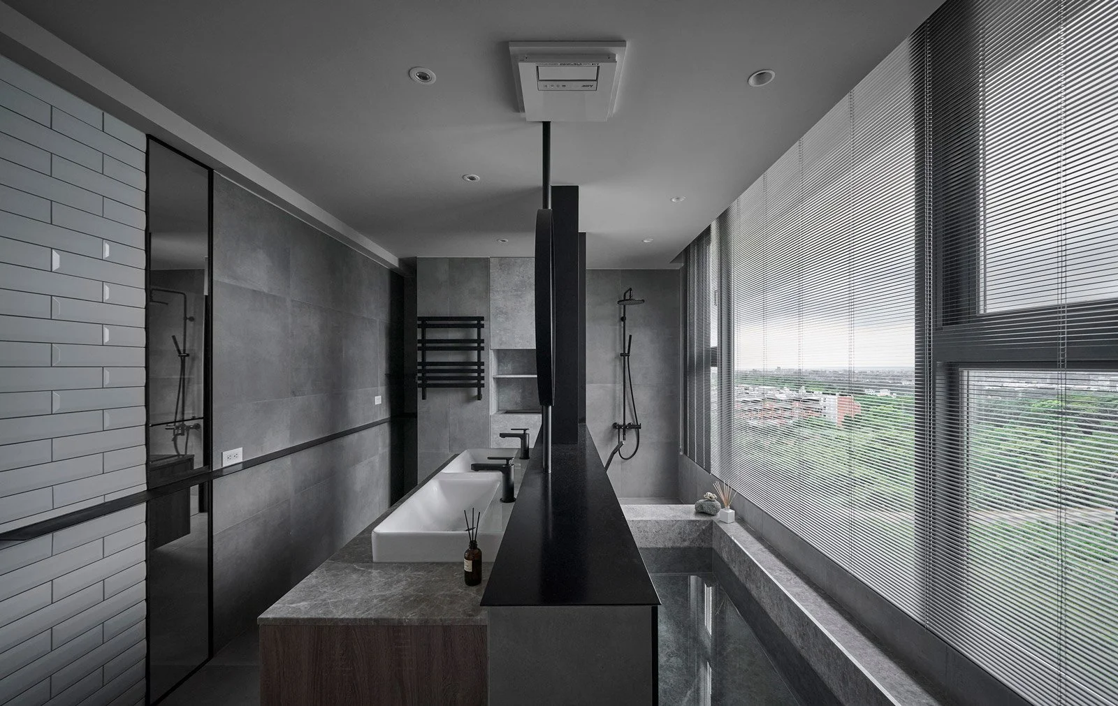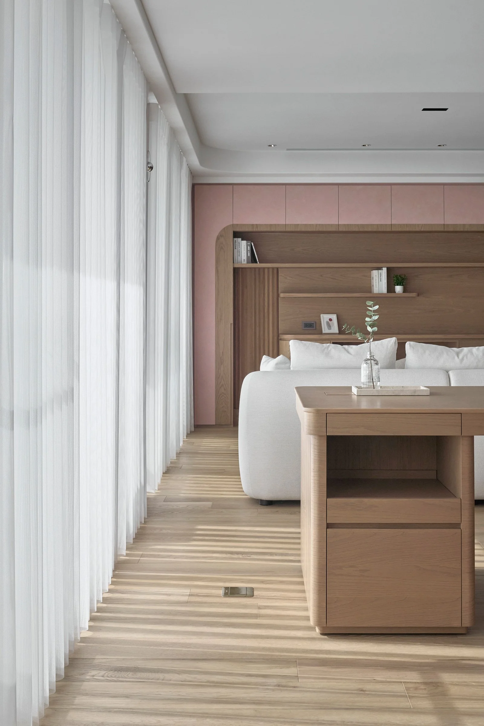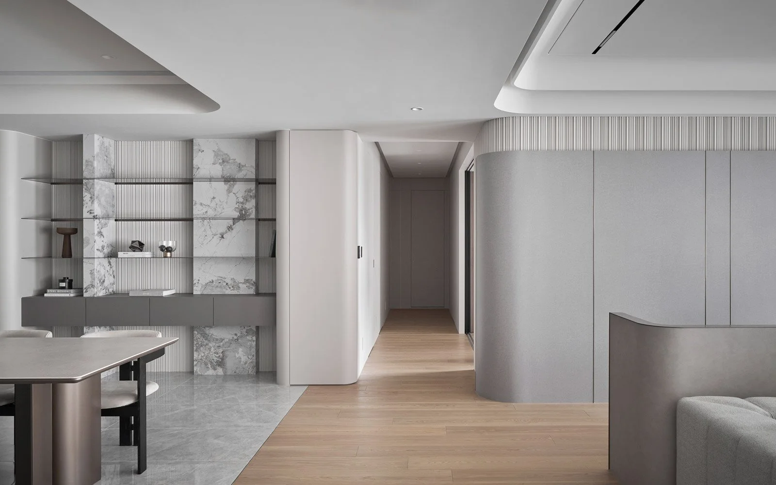 他精準地解構空間,每一次構圖皆沿著軸線展開,進行切割、對位與重組。在營造氛圍、進行感性敘事的同時,他亦追求清晰秩序的可視性。牆面間的對稱、轉角的對齊、深度與前後景的配置,皆化為空間語法的可讀線索。