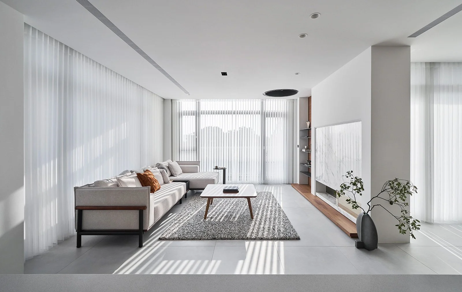Symmetry between walls, the alignment of corners, and the calibrated depth between foreground and background all become readable cues within a spatial language.