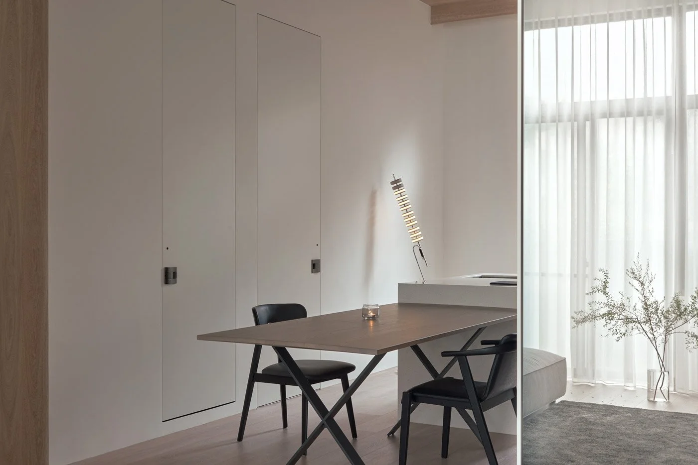 • Jeff recalls a residence in Neihu with a double-height layout as a turning point in his career. Faced with both structural complexity and tight budget control, he introduced subtle shifts in levels and used a clean white palette paired with light wood tones and natural light. Together with the greenery outside, the space took on a quiet vitality and a sense of everyday storytelling.