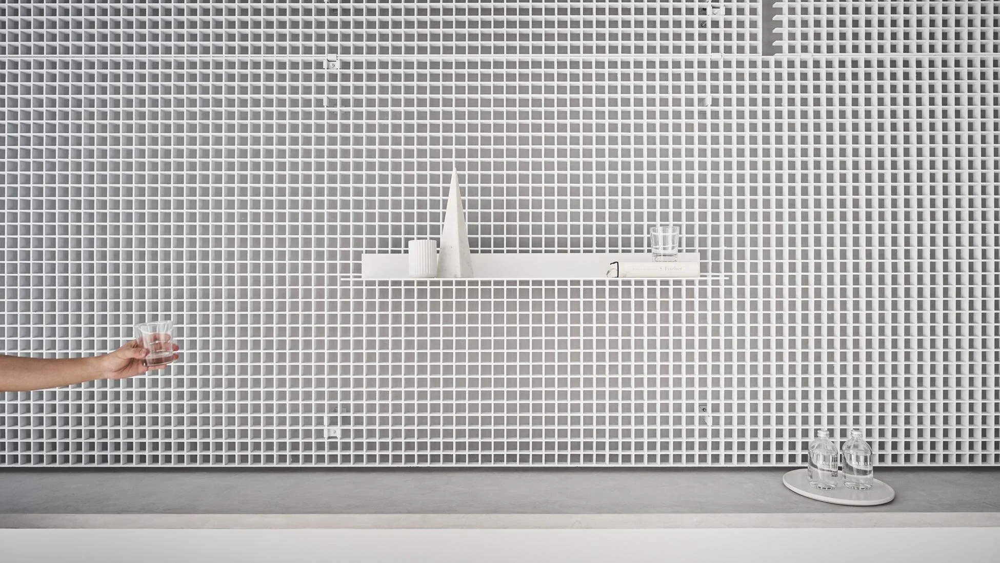 對向立面則設置了簡約的網格層架,整體拉伸到天花板,與圓桿區塊形成若有似無的交集,既能隨性獨立發展,還能相互交織成完整的展覽區域,模糊邊界、構築出另一種空間深度。網格本身的質地相當特殊,原本多被作為戶外使用,這一次設計師引介入室,轉化其現有樣貌,粗曠卻不失細節的模樣,協同藏在內裡的光線,將空間的輪廓表情描繪得更加鮮明立體,完成一場成功的試驗。