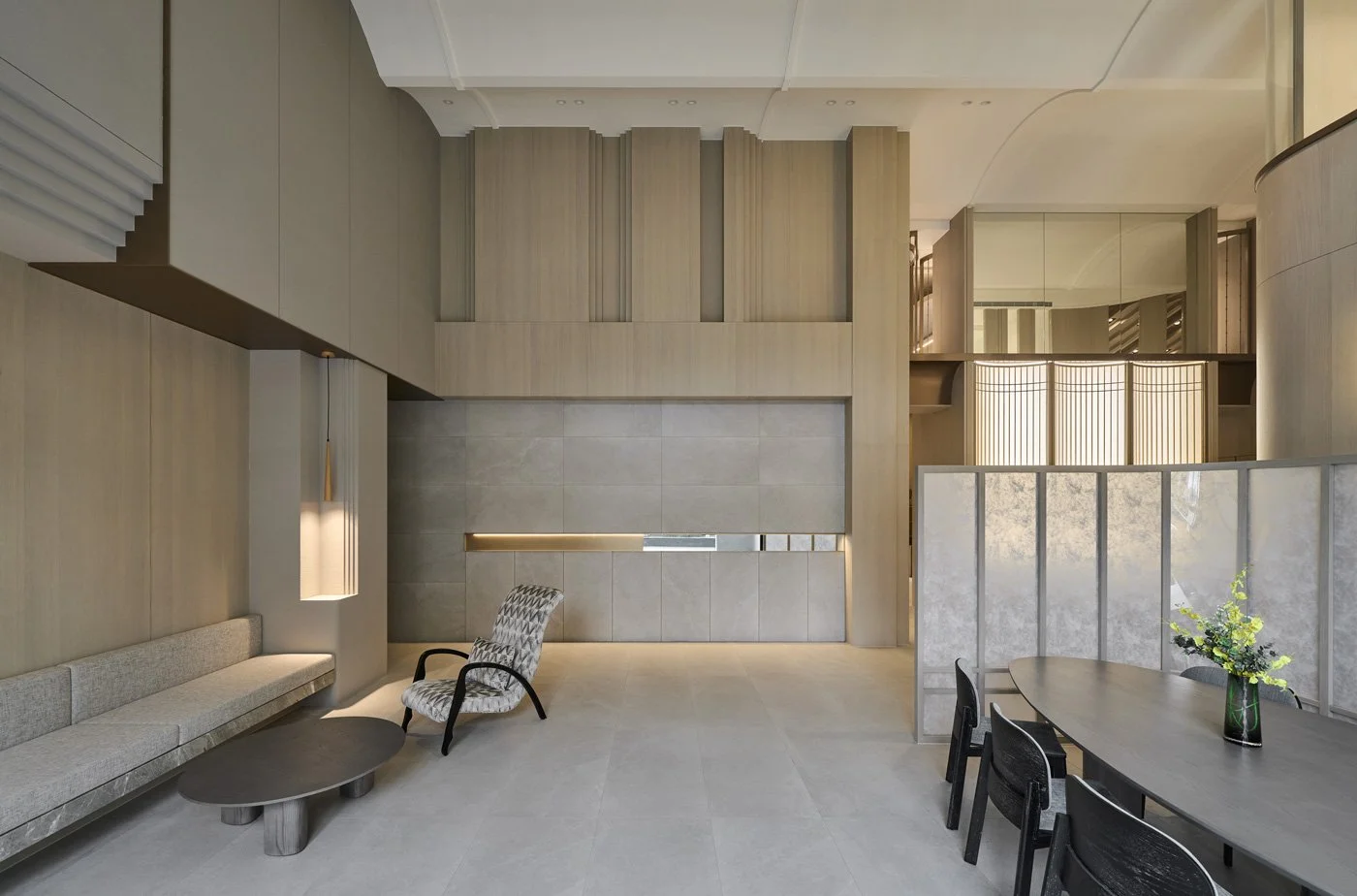 設計團隊精確地利用材質元素的迴響與進退面的陰影疊襯,構建生動柔和的韻律感,在視覺上產生流動性,帶來寧靜。這份寧靜在不斷的重現中逐漸演變為內在的和諧與共鳴,引領觀者在序列的融合間穿梭,每一次視角的變換都揭示新的細節與美感,提供一種匯聚感官與觸感的細膩體驗。