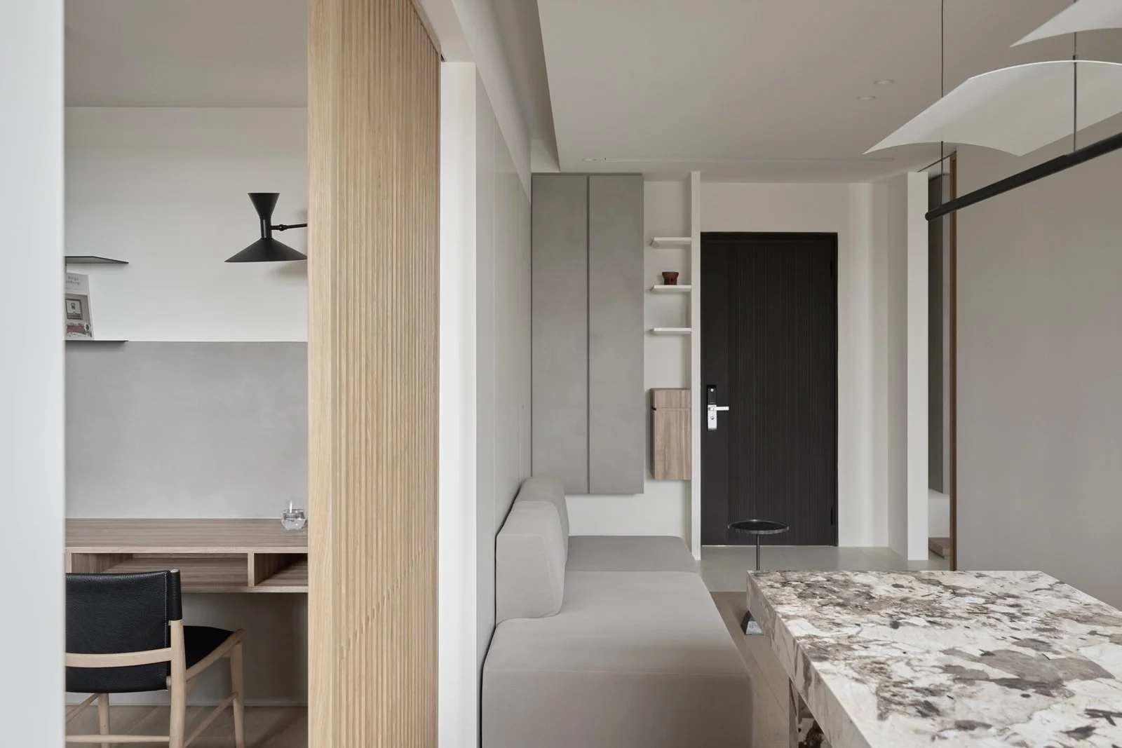 人們在沈澱過後,心境總顯得清晰而明澈,於是能明朗覺察出生活中孰是必要、孰非必要,再將這份心念交由設計師轉化執行 —— 居者作動的身影、光通與氣流、簡致寧靜的氣息,皆被緊密交織在16坪的空間範圍,日夜不斷地穿梭交錯。每一瞬間,靜謐與流動於此完美交融,在歲月的推移裡,圍繞成浩大的回憶川流。「家」不再只是住所,而是一個充滿靈性的生命容器,任生活的痕跡與美學意識自由交織、碰撞。