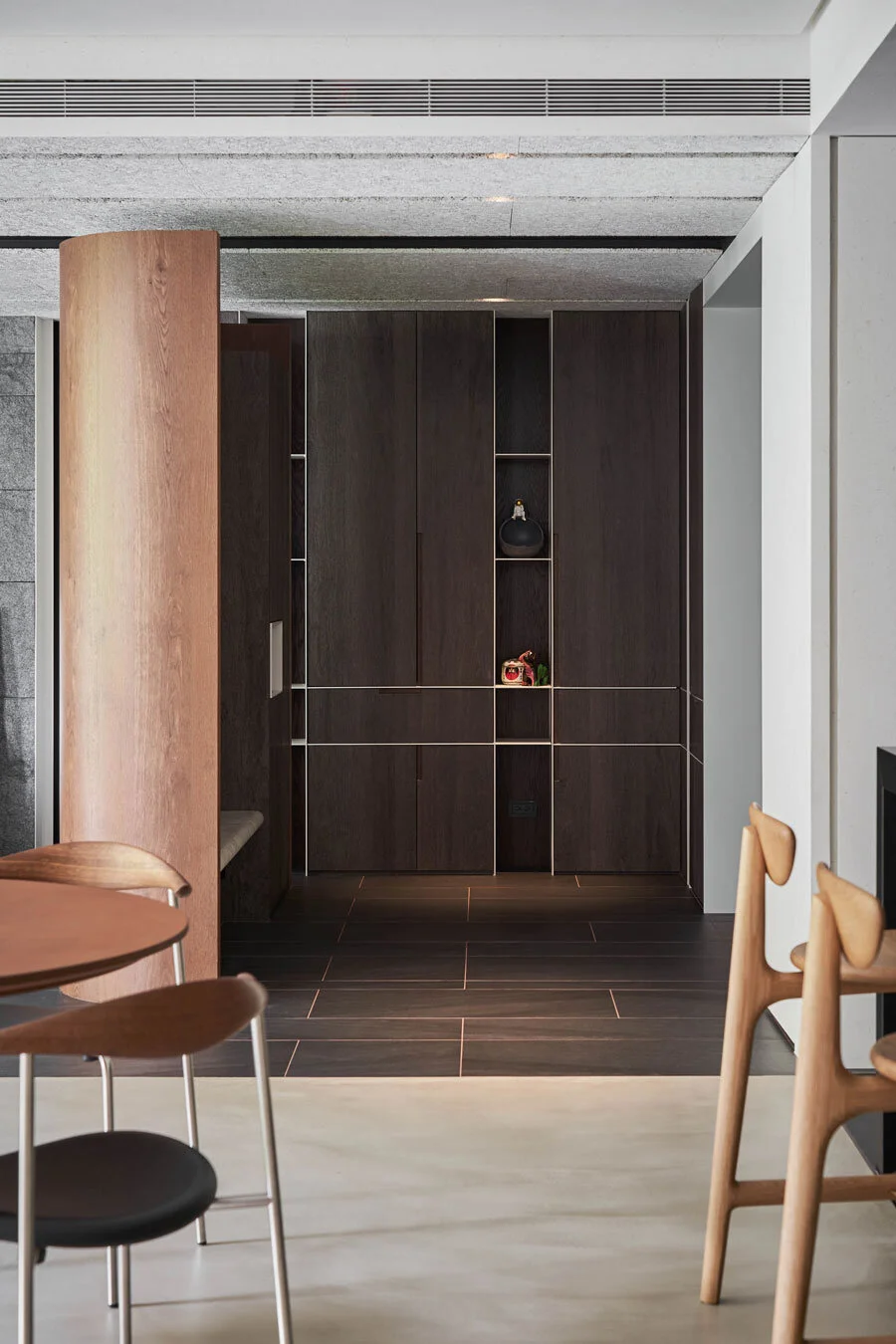 這處寓所即是這麼美好的存在著,以放鬆自由的愛牽繫著整個家族的情感,讓位處他方的家人彼此緊密地連結,相互照顧,卻又有著呼吸獨立的空間。聯合為一家四口規劃室內空間的 弎見設計 謐空間,特別將屋主的家族核心思維運用於建構此空間之中,以「去中間化」概念重塑傳統家宅格局,破除單一空間為重心的設計,開闊生活起居空間,串連中島吧檯廚房,泡茶長桌與客廳,讓全家人能夠從容自在地享受日常的細節瑣事,創造住宅更多元的可能,熱情好客且喜愛料理的男女主人得以輕鬆愜意地接待親友拜訪,家族孩子們也能開心歡樂的玩耍,建立家人彼此間的緊密情感。