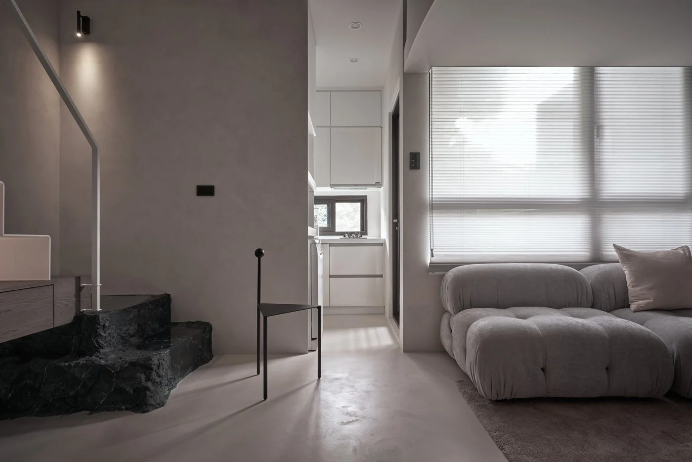 運用曲線的流線輪廓和巧妙夾層設計共築的七坪居宅,完美言述了「當建築輪廓遇上富含詩意的規劃」,所激盪而出的美好相遇 ——這是場關於品味、感知與想像的不朽篇章,方寸之間,盡是美學與功能的深思熟慮。程作設計以純熟的配置手法,為微型空間增添優雅的動感與層次。鬱綠石材的粗獷與木頭的溫潤相得益彰,在中性塗料為主軸的素雅牆面襯托下,視覺達成全面性的和諧平衡。思量周全的編排,既豐富了空間質感與情感深度,也完整體現理性而雅緻的場域性格。