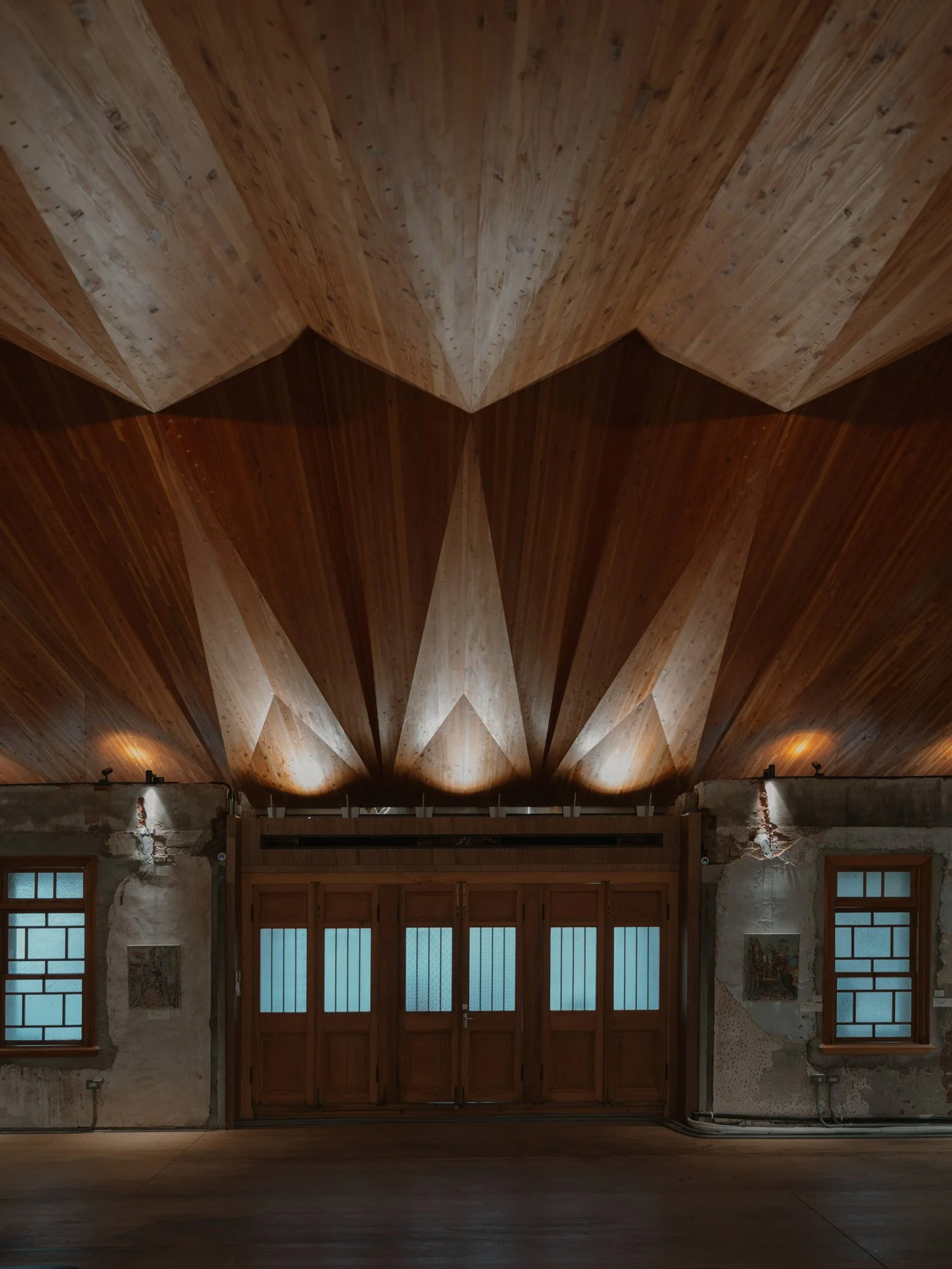 Considering the need for both strength and span, as well as material stability and expression, the design team chose to use GLT Glulam (Glued Laminated Timber) to reconstruct the roofs of all five buildings. The result is a series of curved and folded roof planes that depart from traditional profiles, bringing a renewed spatial character and giving tangible form to the principle of “restoring without replicating.”