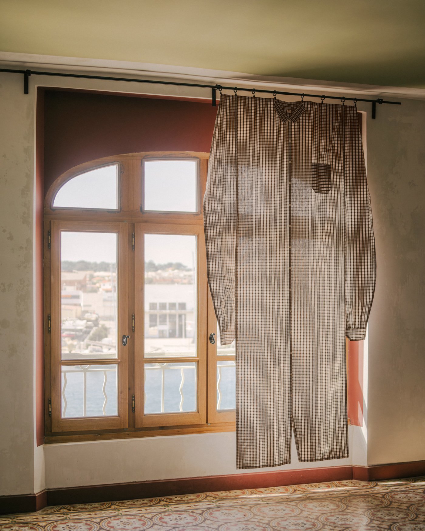 In her "The Apartment Gets Dressed" series, Sarah challenges the boundaries of traditional soft furnishings by integrating distinct sartorial features, such as shirts and trousers, into her curtain designs. These pieces retain the silhouette of the garments and preserve the curtain's light-filtering function while presenting a surprising artistic form.