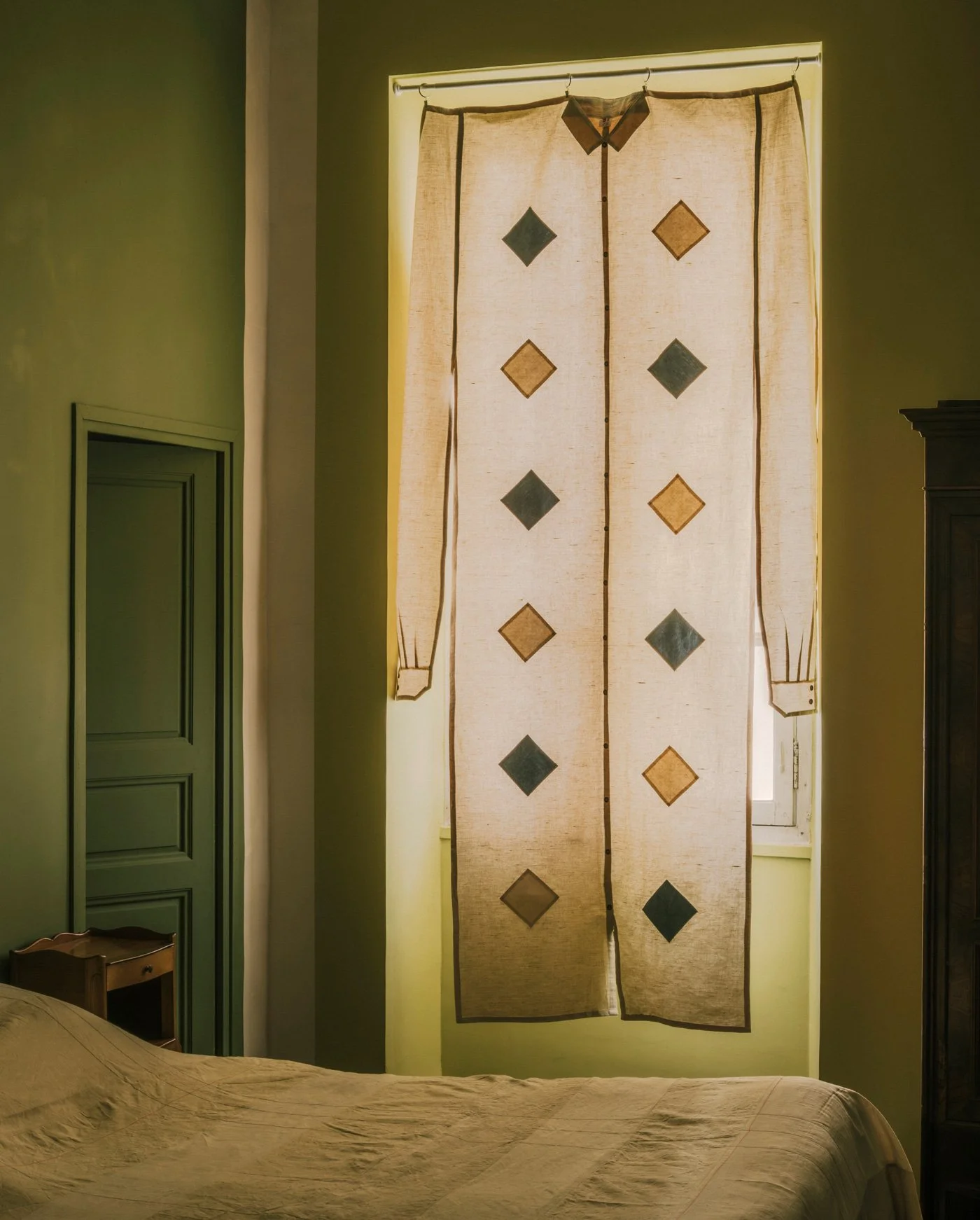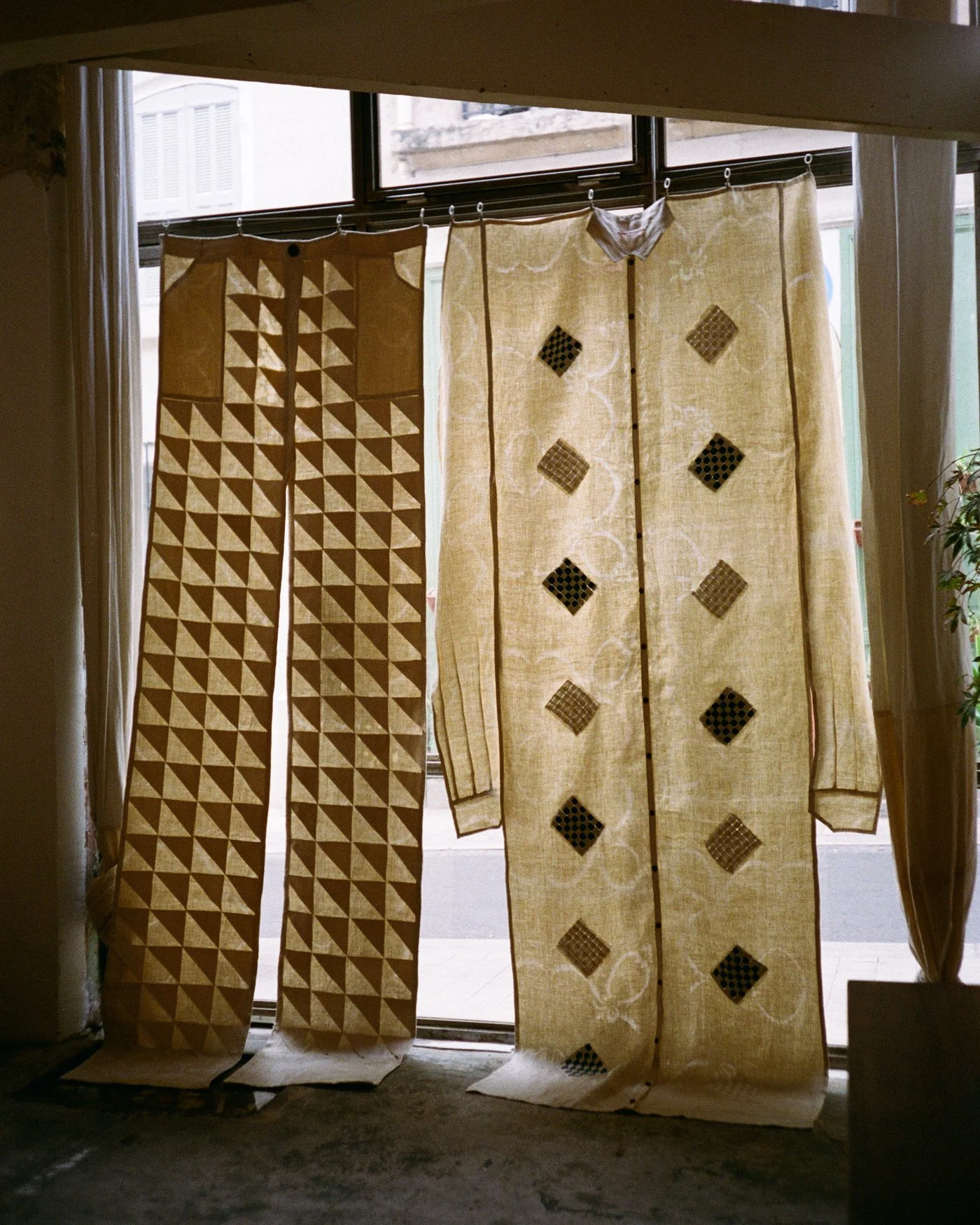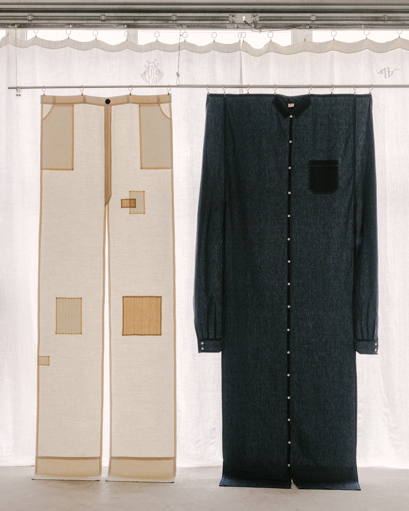 The original intent was for the two to coexist as both curtain and garment. They are not merely enlarged clothes. To remain faithful to the essence of a curtain, I retained only specific sartorial details. I enjoy how the pieces adopt this unusual form while fully maintaining their functionality as curtains.