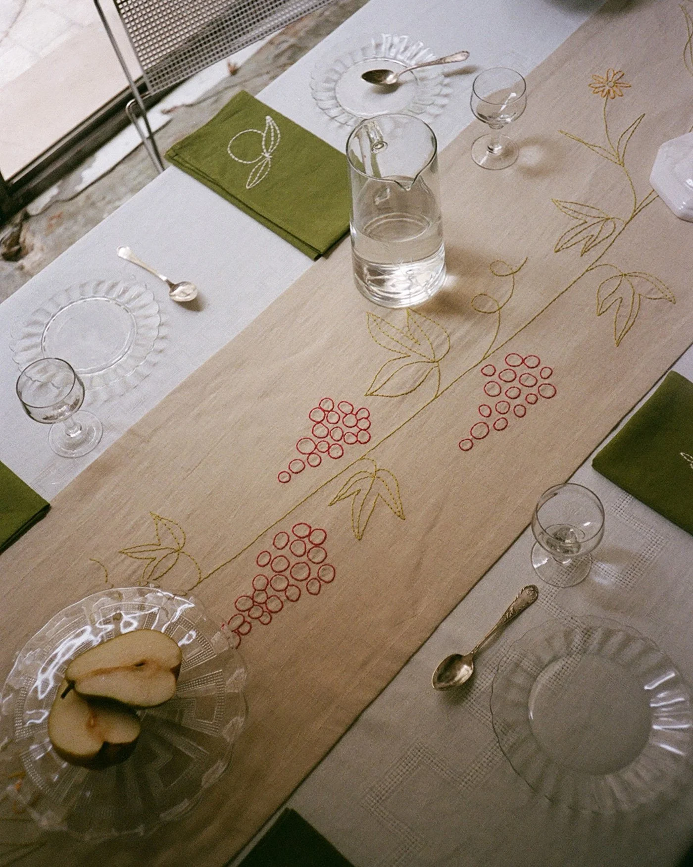 • Q: Your tablecloths feature extensive embroidery. What role does this technique play in your design narrative?
