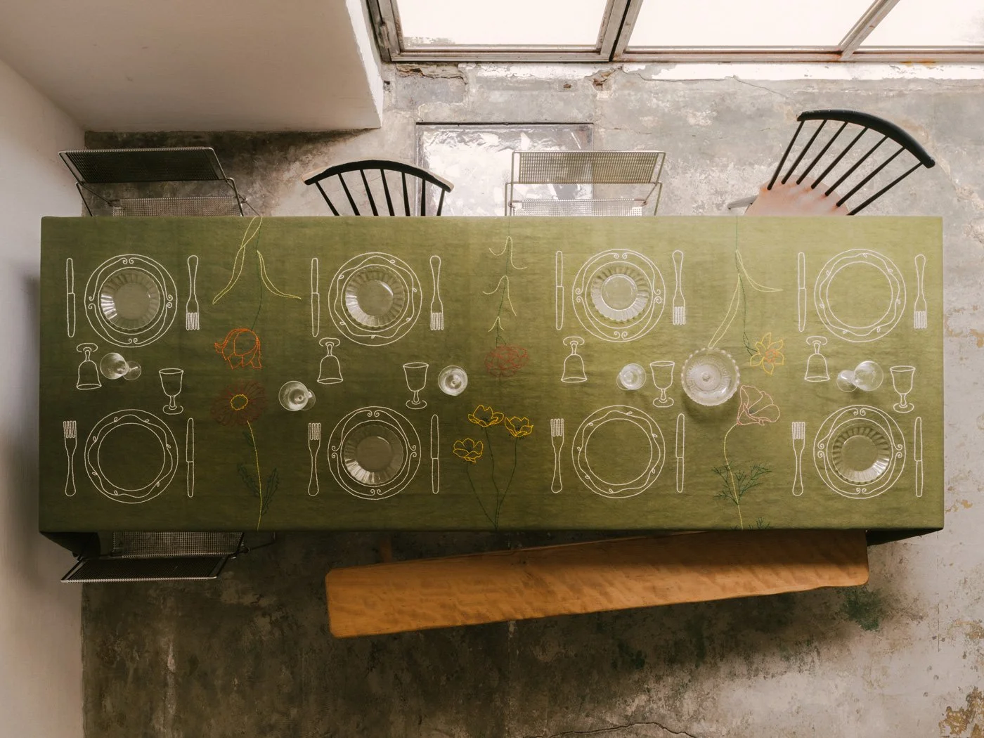 這種重新想像也延伸到了餐桌之上。她將刺繡視為「在空間中繪畫」,為日常桌巾注入溫暖的人情味與社交活力。
