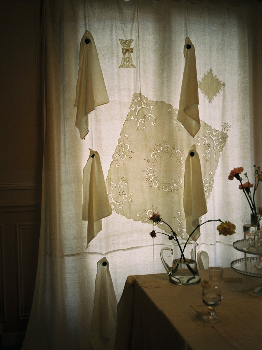 Fundamentally, all my works are designed to be viewed from a distance as I prefer to perceive them as a unified whole. For instance, the trompe-l'œil tablecloths are conceived like paintings to be appreciated from afar. With the curtains, I focus on the overall silhouette and sense of scale while simultaneously attending to details such as the use of real shirt buttons.