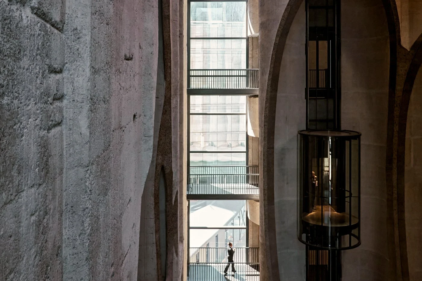 另一個讓他捨不得放下相機的,是由 1921 年舊玉米糧倉改建的「當代非洲藝術美術館」(Zeitz MOCAA)。建築師將 42 支巨大的混凝土柱從中間挖空,形成一個高聳的橢圓形空間。
