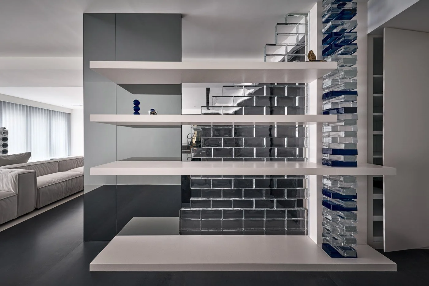 玄關一面藍色實心玻璃磚牆迎面而立,作為內外世界的過渡,讓自然光穿透內部,折射出溫潤朦朧的色澤。從外望向室內,模糊的輪廓隨角度變幻,仿若隱約發光的物件,傳遞沉穩而內收的訊號,並拉開一道緩衝,讓人浮躁的心緒有時間靜下來。從玄關窺探,屋內輪廓如霧如煙,恰似凝視一個尚未完全對焦的光源,愈深入,愈感沉靜,也為進入生活的起點製造一段安靜過場,讓呼吸和思緒都得以稍作停駐。