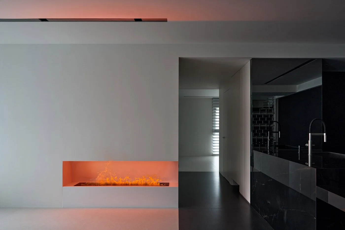 嵌於潔白牆面的火爐,讓空間浮出柔軟的暖色調。若窗外靜無一物,那微光便成為當晚唯一流動的存在,像是為這片刻的安靜添上一絲溫柔脈動。