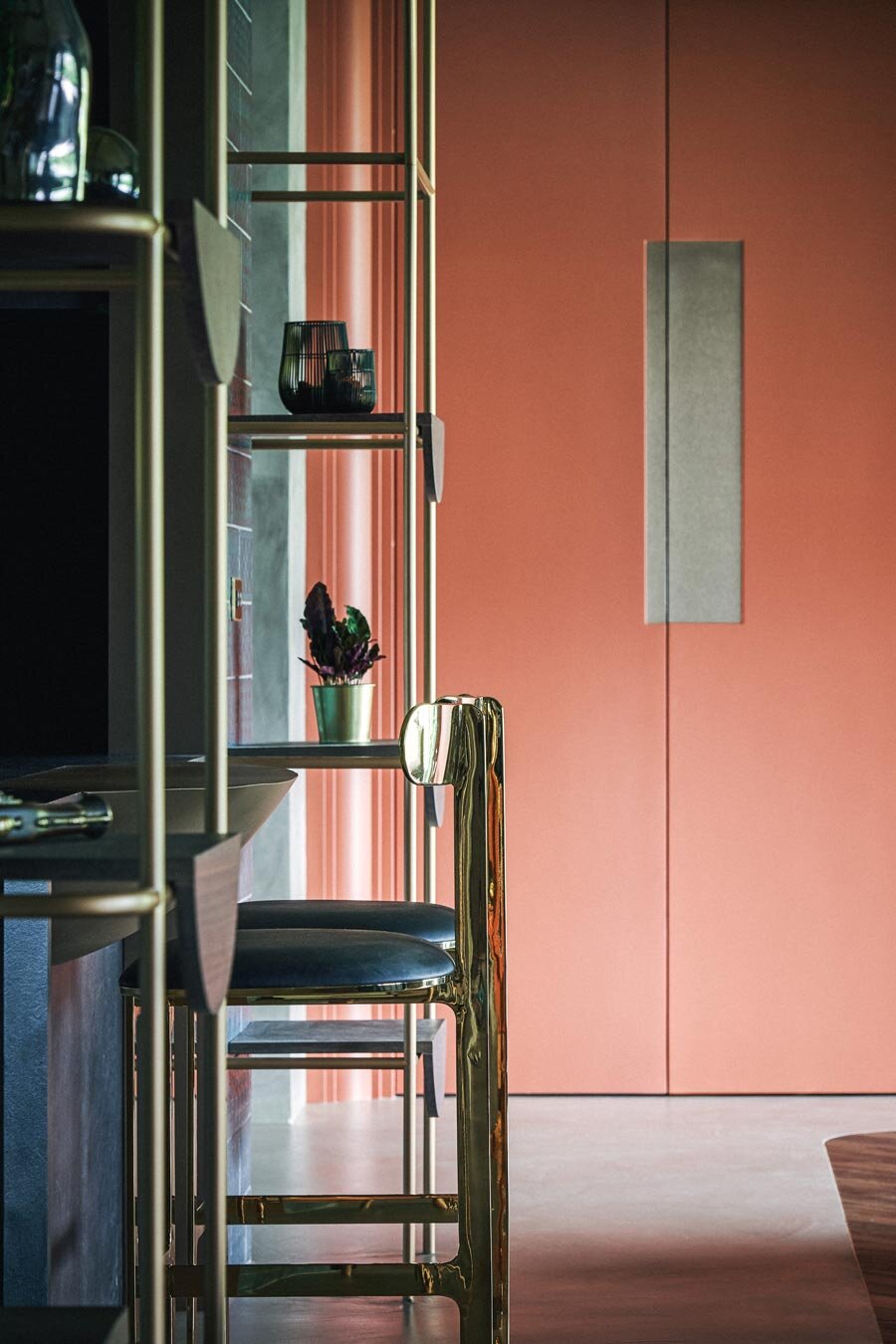 對應著窗外山景的青蔥茂鬱,室內的色調多半運用相對沈穩的暖色調,黃銅、木色、孔雀藍、以及暗灰石色,共組出一種輕奢氛圍,這是從樂於旅行,在旅見各國設計旅店的主人腦裡,調和出的色彩。室內、室外從色彩上產生了一種絕對,卻仍尋到平衡,在暖色中成就安定的家,在明亮色中吸取自然的能量,呼應著人之內外,禪意油然而生。
