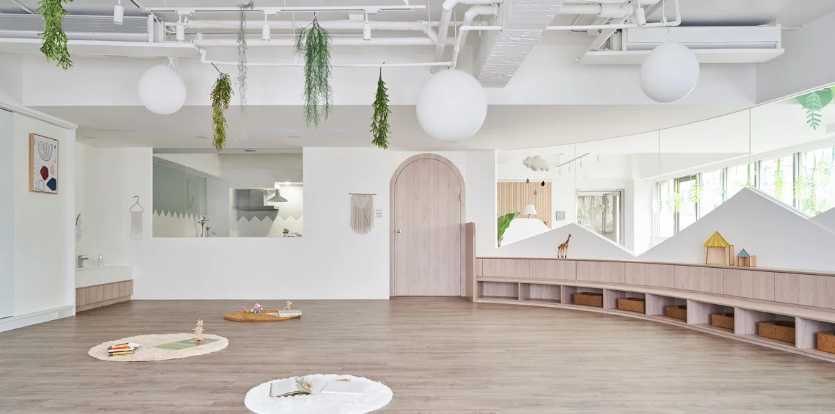 將童話思維寫入空間的鋪陳方式,增添不少奇幻的趣味感,多處弧形及拱門的設置,更精彩了環境本身的故事性。孩子在進入場域的當下,隨即開展自己的短篇冒險記事,無論是用走路、跑跳、翻滾或攀爬的方式,皆充分運用五官來覺知周遭賦予的事物,上與下、狹小和廣闊的對比感受,純淨的內裡質地與窗外綠意和諧串接的平衡,一一拼湊成豐富、啟發探索慾望的有形時空。