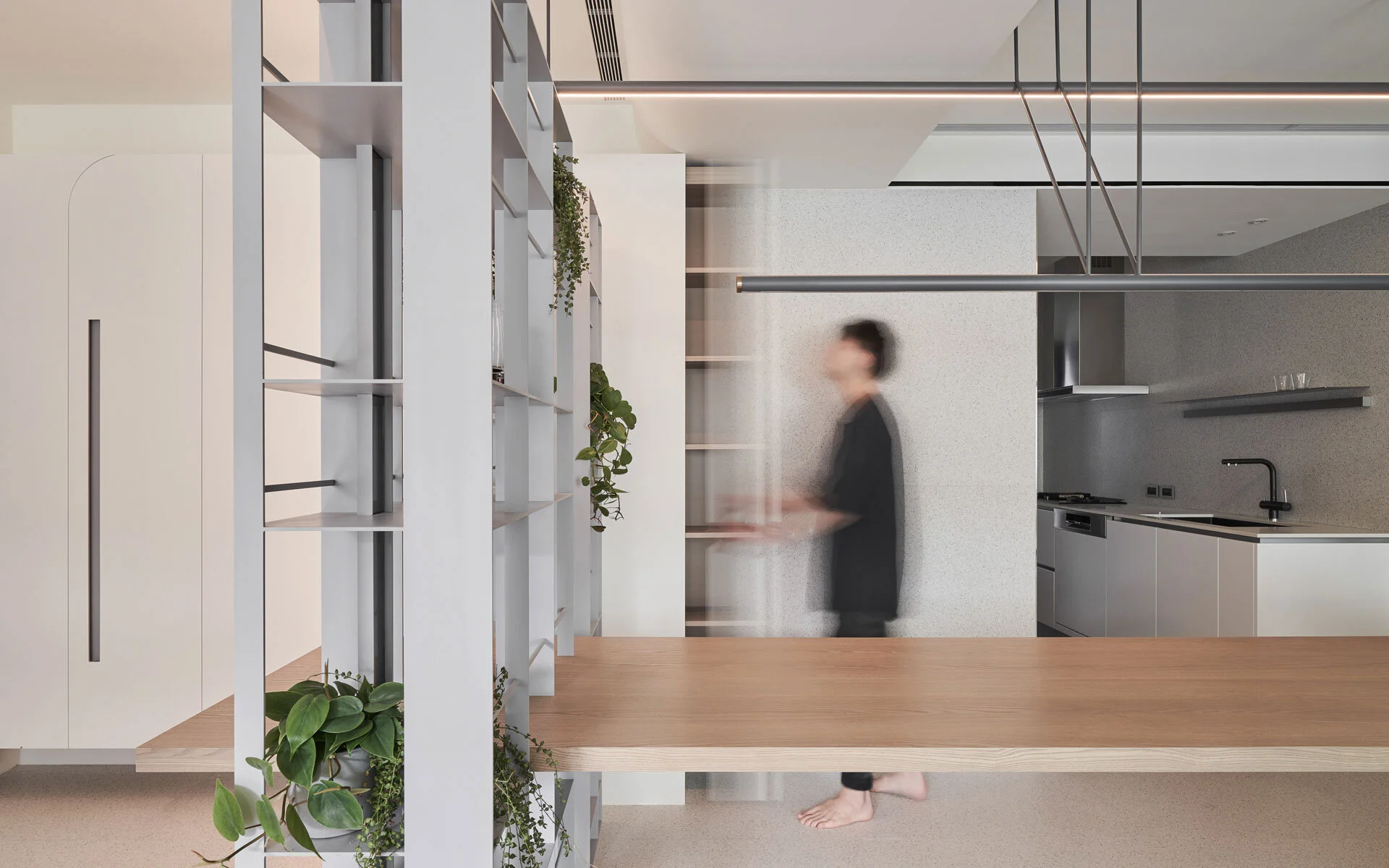 此外趨光性的我們,始終渴望著與日照共同起落。除了在餐桌上佈局了俐落的燈具,橫向的平面則盡可能地打開格局,將光線引入。左側的廚房一路延伸至陽台,將光點斑駁地帶進,右側書房則把制式門板替換成可折式拉門,必要時,將拉門推至底,大片的陽光灑進,把窗外的煦煦晴空綿延至屋內。白色調的起居空間,承接並映和著光線,加重亮度,揮去灰暗,讓生活燦燦如日。