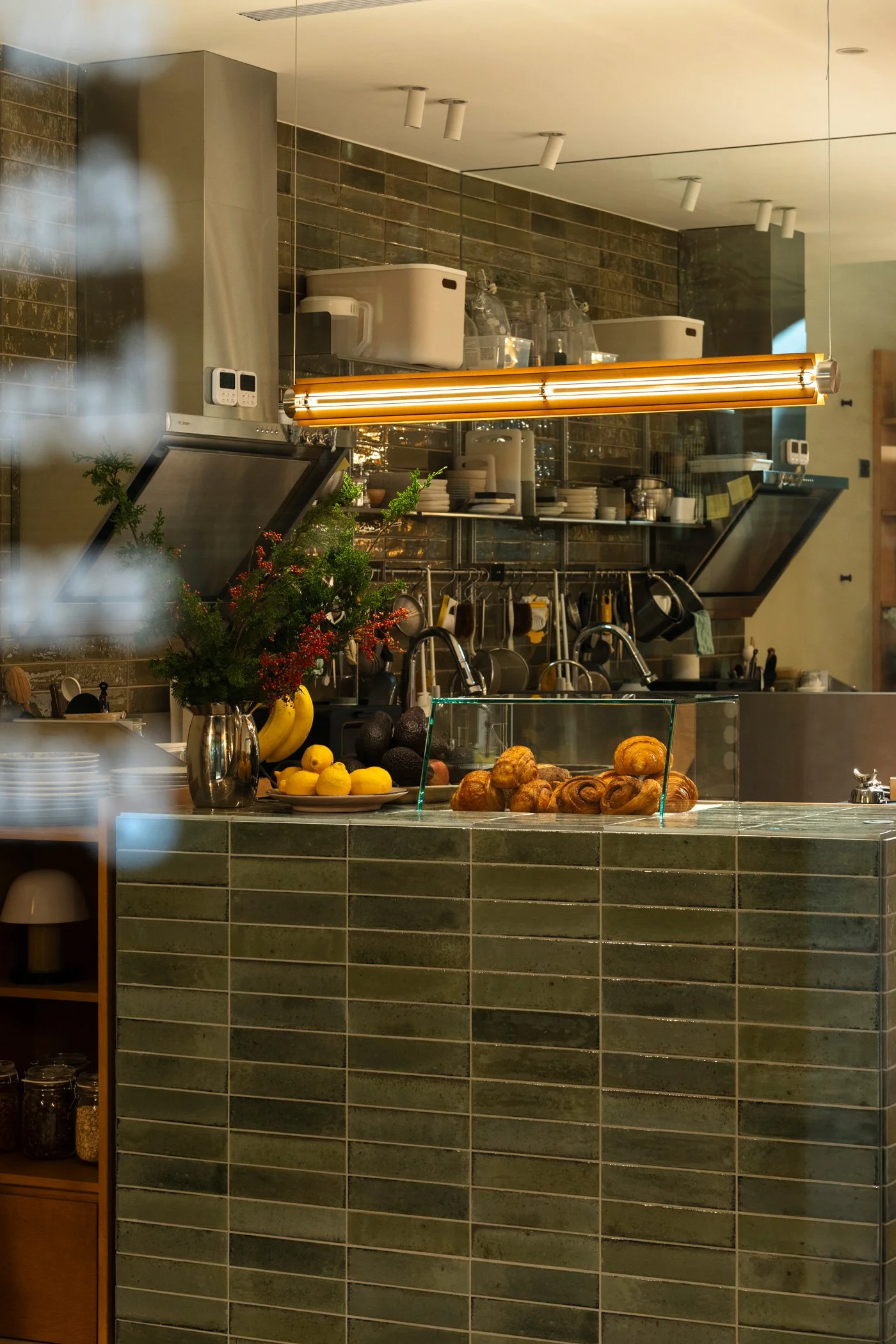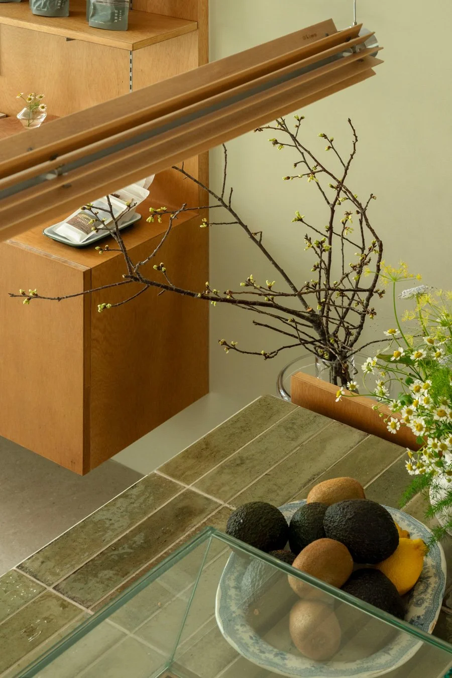 在整體空間的目光落點處,最讓人忍不住駐足的,是懸掛於櫃檯上方那盞來自 Kimu Design 柒木設計 的糖蔥吊燈。以具備台灣設計底蘊的單品,藉由溫潤木片過濾掉銳利光線,將柔和光暈漫開在仿古麝香綠的牆面上,開燈與關燈之間各有層次。這盞燈意外成為來訪者詢問度最高的物件,同時也詮釋 OATGOOD 如何平衡精緻與自然的比例。