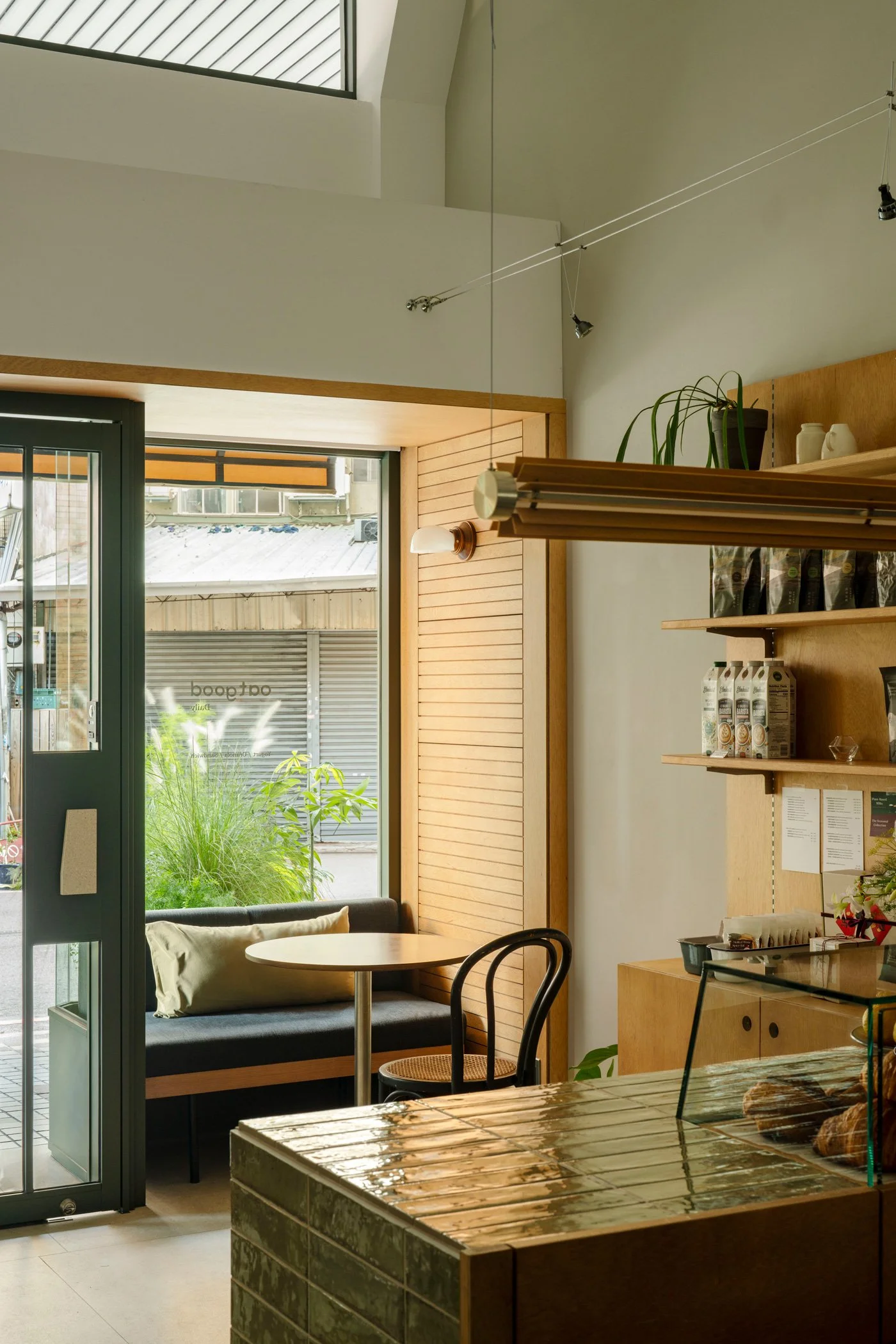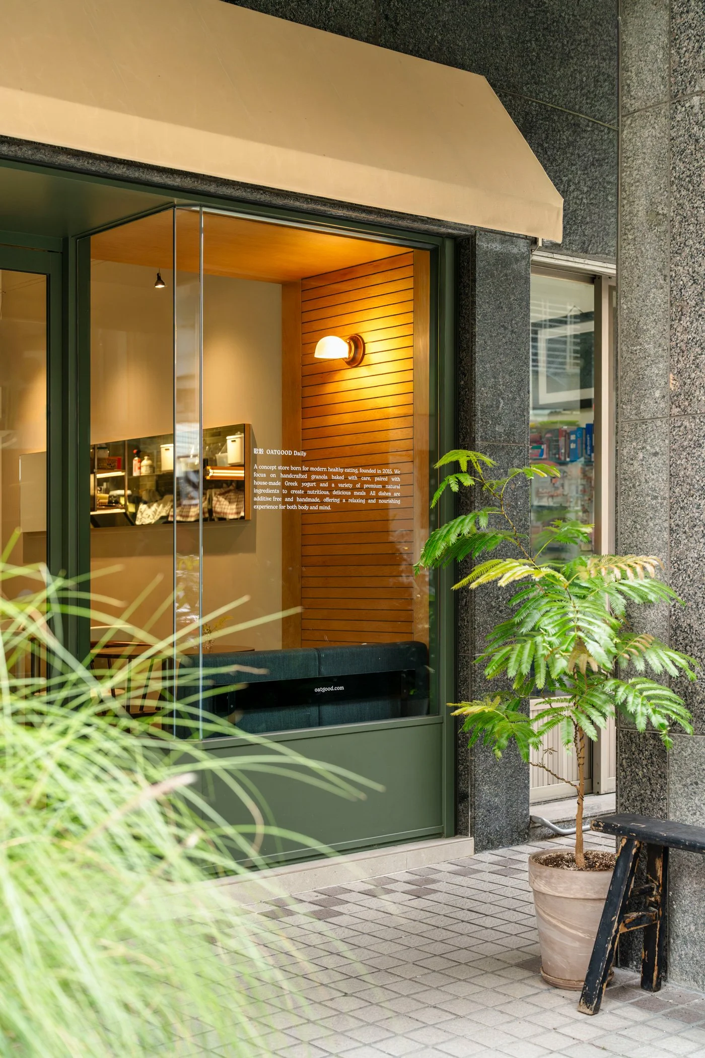 • Within the limited, elongated floor plan, OATGOOD Daily discarded the typical layout—the conventional approach of placing the kitchen at the entrance to facilitate takeout and serving. Instead, to provide visitors with the most relaxing atmosphere possible, they reserved the window area with the best lighting for seating. The recessed spaces on both sides of the entrance create a secure, cocoon-like feeling reminiscent of semi-private booths. Bathed in gentle natural light, this design gracefully compensates for the naturally dim conditions of the old building. Sitting on the window-side sofa, watching the English garden-style plants swaying in the breeze outside—this sense of comfort and healing is precisely the daily proposition OATGOOD wishes to offer its guests.
