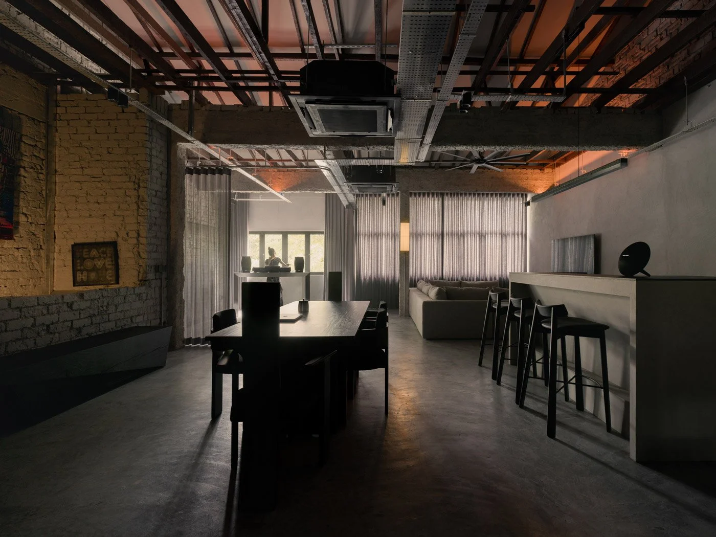 The existing shophouse layout presented both challenges and opportunities, prompting the team to rethink how the space could be experienced. Surrounded by detached houses and artisan cafés, the neighborhood carries a quiet sense of seclusion alongside a subtle undercurrent of creative energy. This tension inspired the designers to imagine a space that stands apart yet resonates with an artistic presence. Approaching the project through the lens of Brutalism, Oblivion Lab reinterpreted the once cold, industrial aesthetic into a cohesive expression of raw materiality and authentic, lived-in warmth.