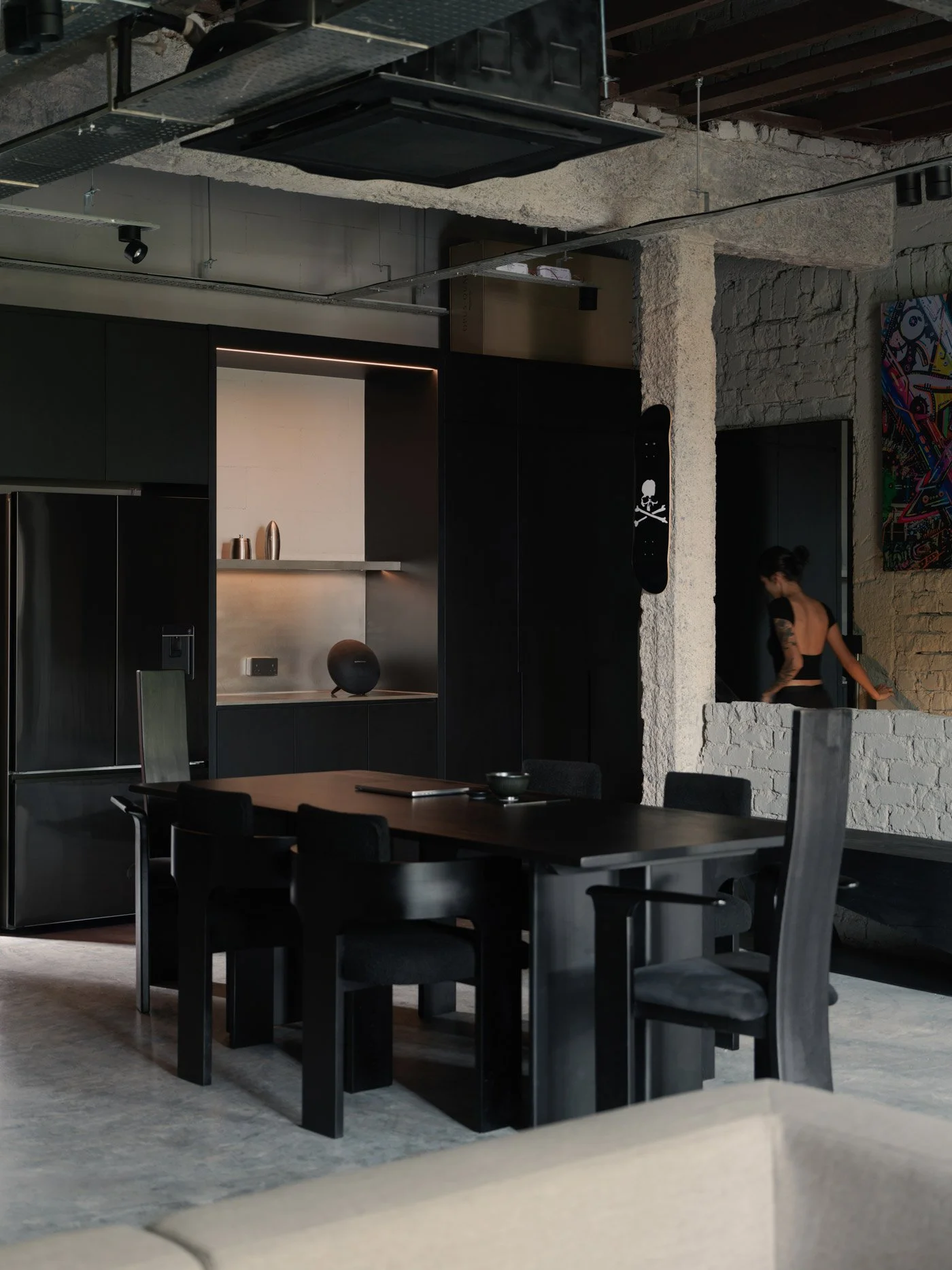 Against this tonal base, layers of steel, matte black details, and untreated surfaces add both depth and durability. Within this restrained composition, subtle variations in texture and finish introduce a quiet sense of tension and character, defining the space through material presence rather than ornament.