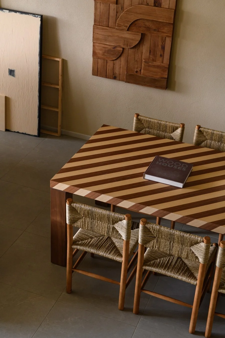 Adjacent to the living room, the dining area features a statement long table defined by bold, diagonally spliced wood. The interlacing depths of the wood grain mimic the texture of the earth itself, fitting perfectly with the rustic, handmade quality of the woven dining chairs. this rugged volume anchors the space, extending that visual warmth into a tactile, reliable presence that invites family members to gather and linger in conversation.