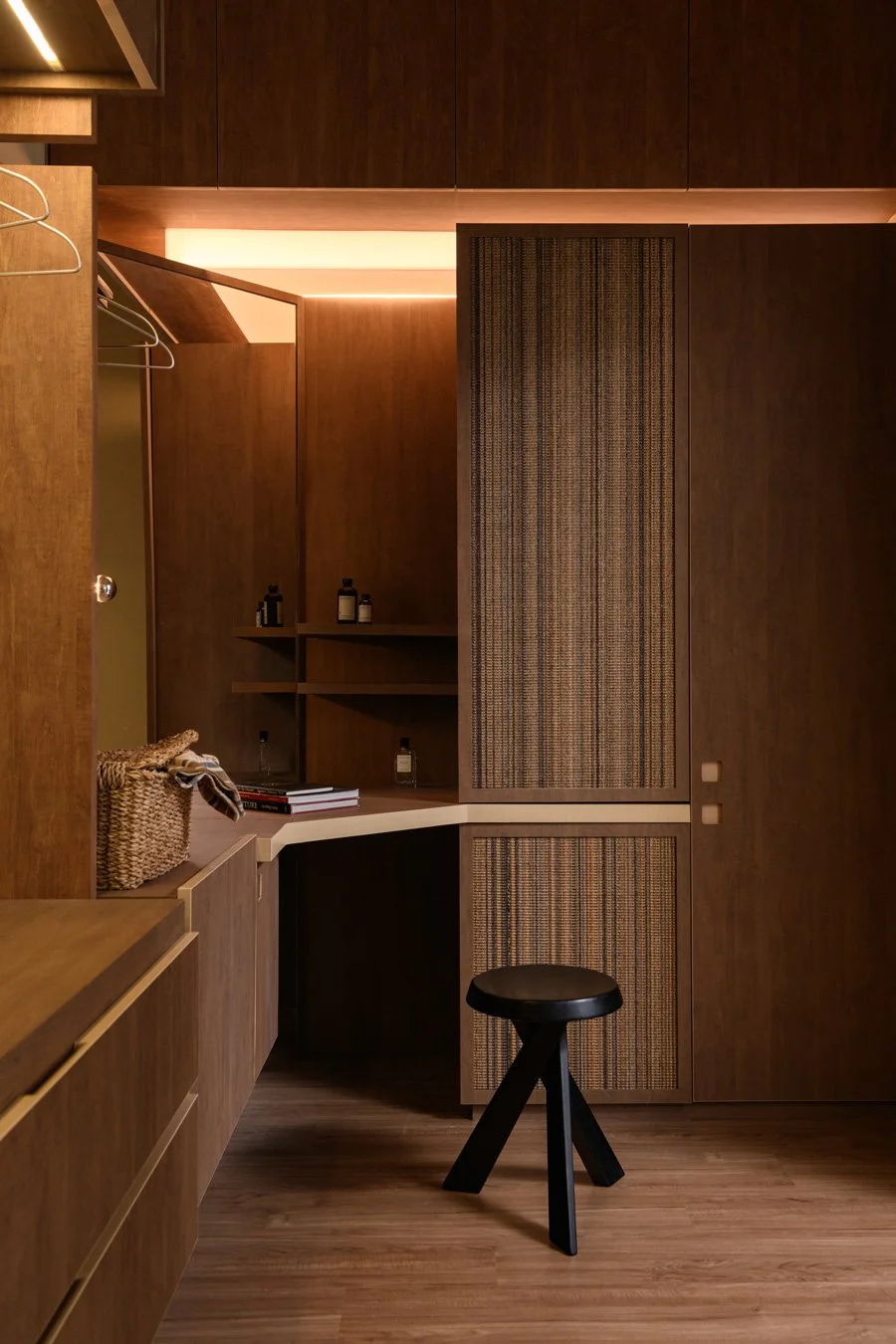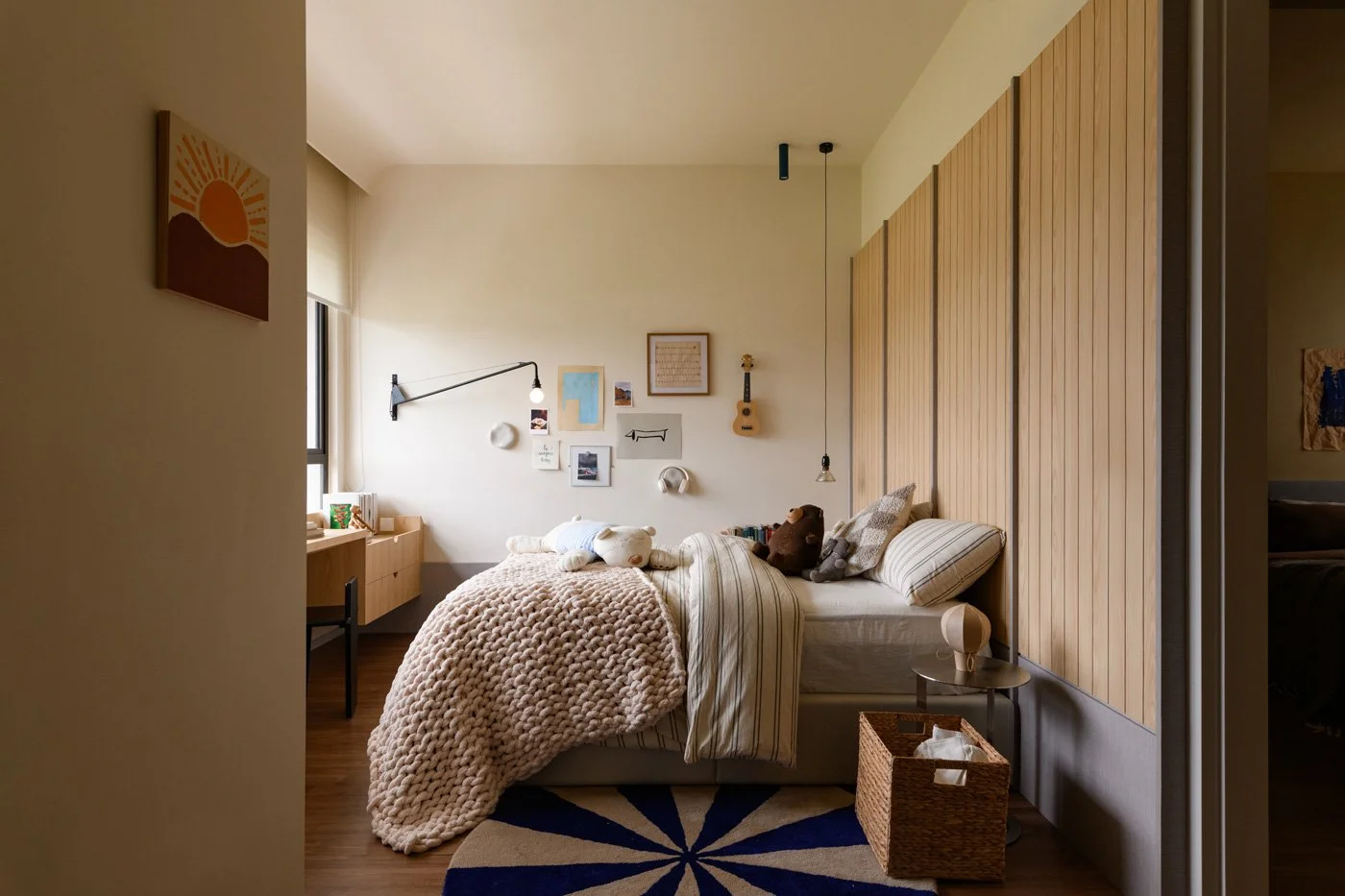 This quiet design narrative extends naturally into the sleeping quarters. The master bedroom continues the theme of warm minimalism. An open-concept wardrobe eliminates doors, allowing daily attire to become part of the interior landscape. The sleeping area is stripped of superfluous decoration, relying instead on the honest, soft touch of materials to cocoon the inhabitants in comfort. The children's rooms allow for more expression of personality, maintaining the overall tonal harmony while preserving the unique perspective of a youthful spirit.