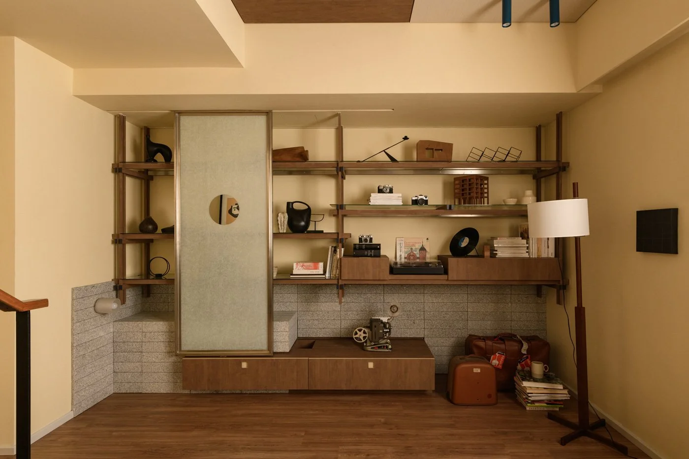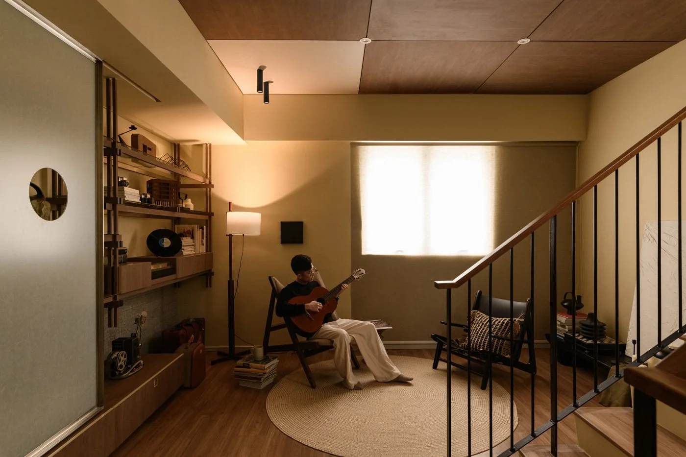 拾級而上,空間氛圍隨之轉換,由對外的交際轉向個人內在的沉潛與探尋。二樓轉角處被釋放為一處製造餘裕的緩衝地帶。輕鬆無拘的休憩角落,像是在公共與私密之間留下一個停頓的中場。開放式層架上陳列著生活軌跡。當唱機裡的旋律流淌,倚坐在單椅上回顧過往,一段自我調整的留白時刻就此展開。