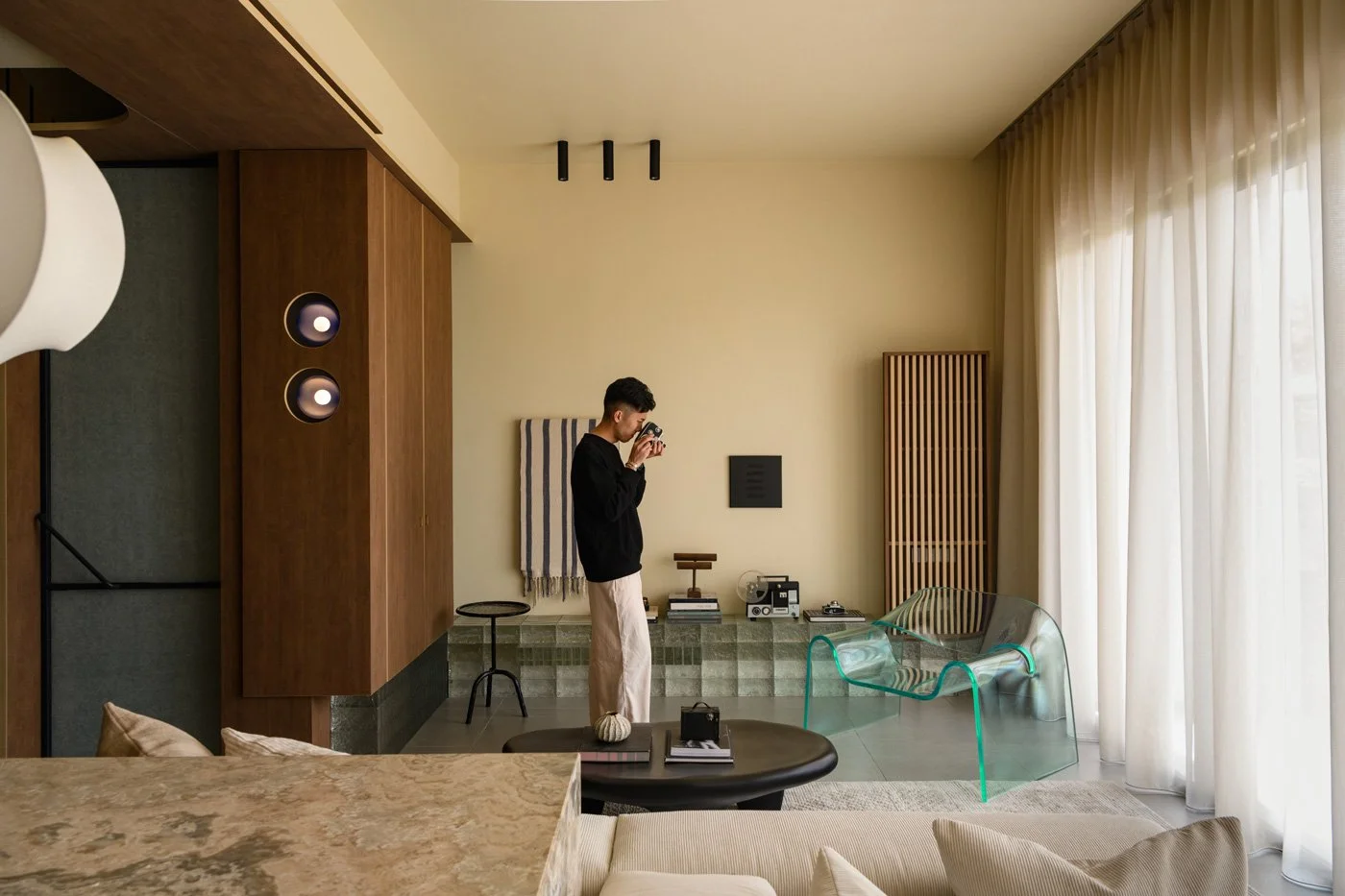 The ground floor public area serves as the overture to this symphony, presenting a subtle dialectic between the solid and the permeable, the rigid and the soft. Steady marble countertops use clean lines to establish spatial order, contrasting with the plush softness of fabric sofas. Meanwhile, the combination of wooden cabinetry and glass block platforms demonstrates a coexistence of warmth and transparency. Light filters through the crystalline glass blocks, creating hazy, overlapping silhouettes and interpreting an elegance that is modern yet deeply inviting. The leisurely feelings usually reserved for holidays are here transformed into a constant state of being.