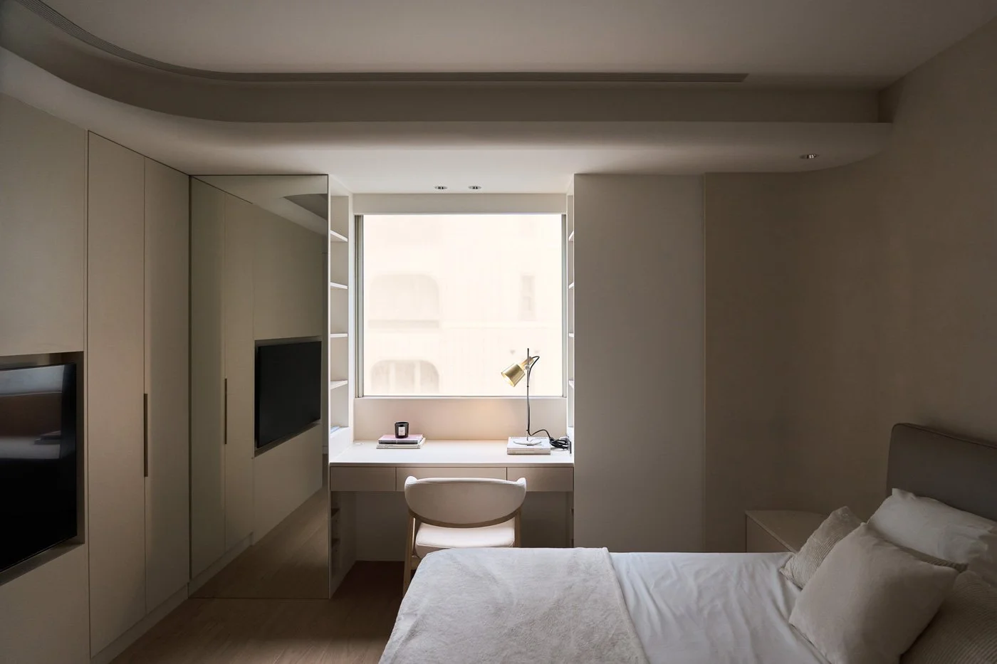 • In the private quarters, the design becomes more streamlined. The sister’s bedroom continues the gentle tone of the main living area, using soft materials and low saturation colours to create a calm and grounded atmosphere. The brother’s room, in contrast, features darker furniture and open storage that reflect his preference for ease and a more relaxed way of living.
