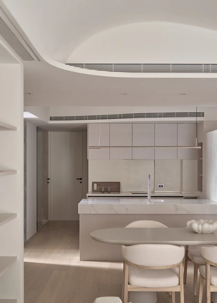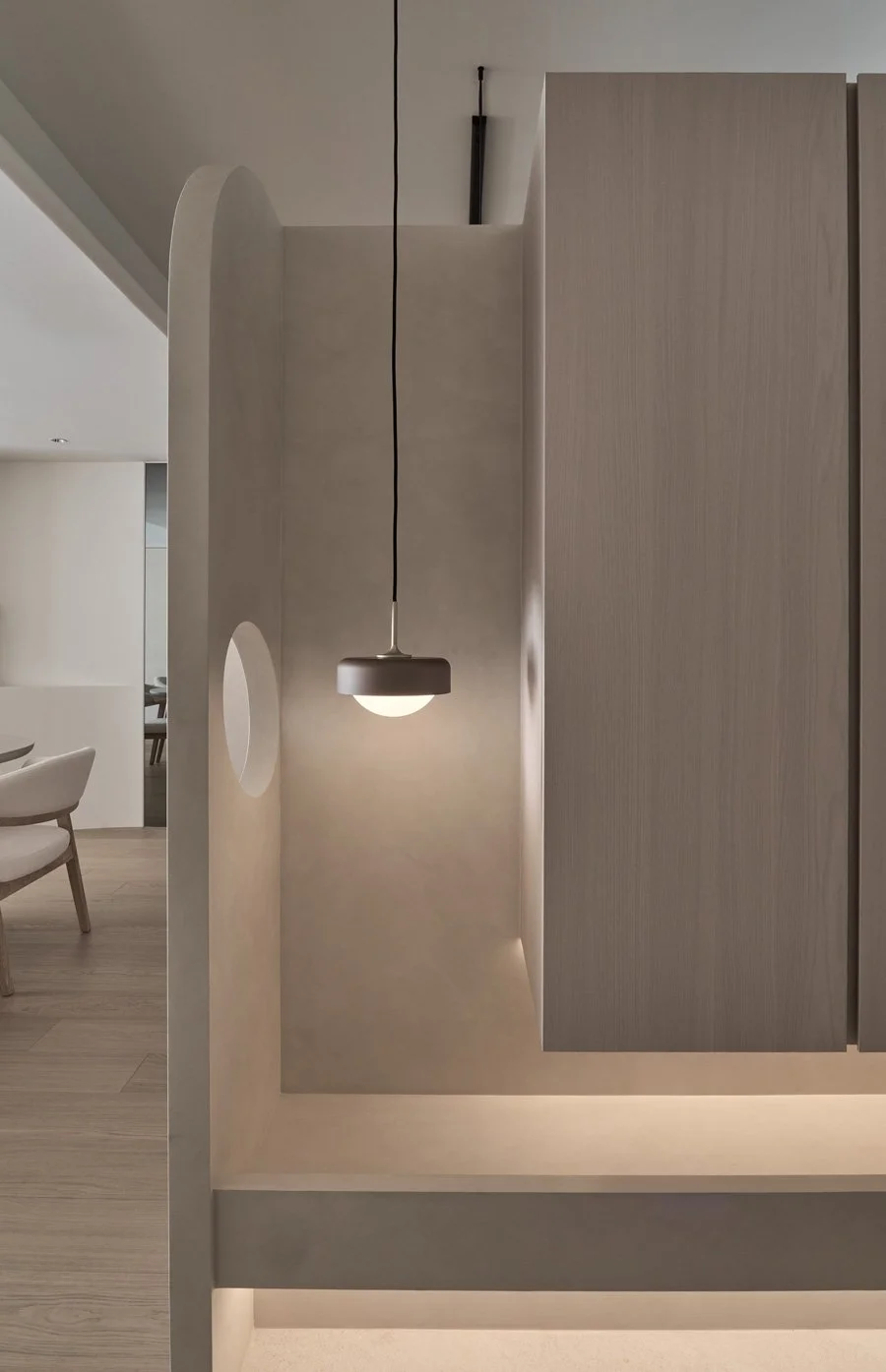 沿著起伏的電視牆入內,則可見豁然開朗的公共區域。彎折創造了流動,也放慢了回家的步伐,彷彿在移動間,就會被線條引導至更敞開的場域。開物設計總監形容公區天花板的開闊推展為「自然上揚的流暢感」,在此空氣得以迴盪,視線也被溫柔地打開。中島天花則延續了整體的曲線語彙,以圓潤轉折與弧形收邊,銜接公區造型,成為視線與空間感知之間的過渡。