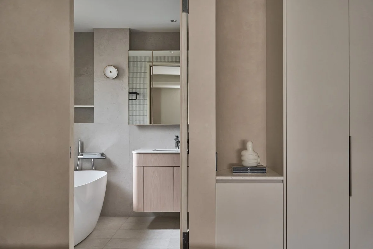 色彩與材質上,設計團隊以帶灰調的特殊漆、淺色木地板與細膩石材,構築沉著優雅的基調,其中屋主偏好的粉紅色,也被優雅地轉化為一種近乎米白的灰粉色,白日溫和、夜間微亮,隨著光線推移呈現出截然不同的情緒。整體空間刻意避開粗糙強烈的質感,轉而選擇柔和滑順、手感細膩的材料,讓人即使輕拂牆面,也能感受到住宅所欲傳遞的平和心緒。