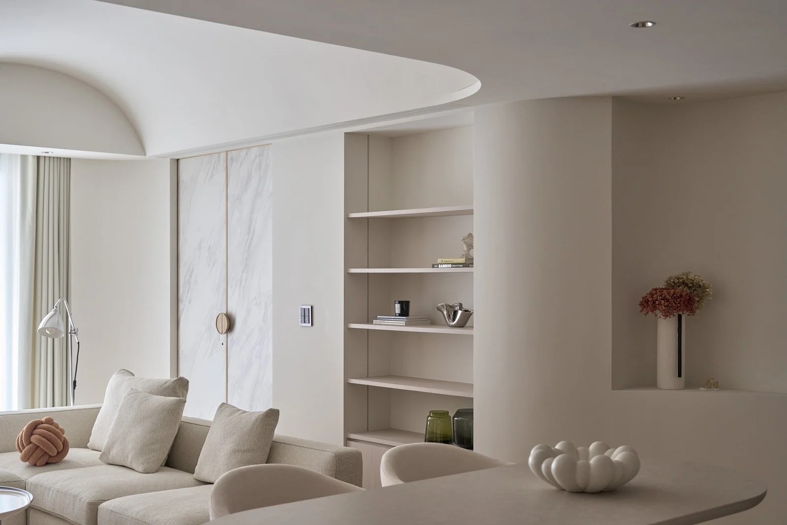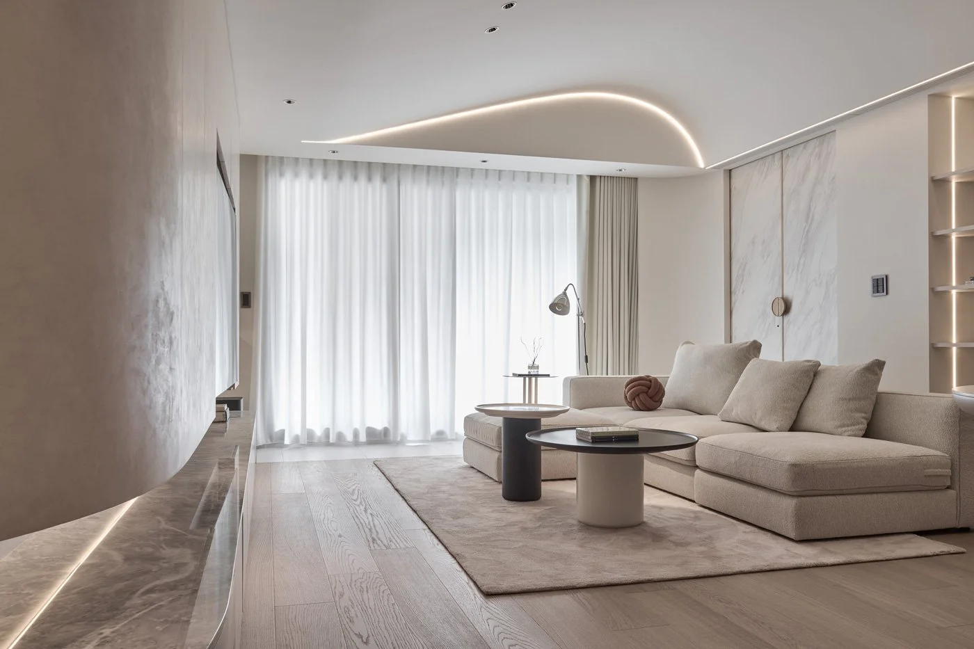 The home is composed of a continuous sequence of curved elements that extend from the entrance through every area. Ceilings, walls, furniture, and corners unfold like layers of folded paper. Nothing is symmetrical. Each curve responds to structure, circulation, and the way the residents move.