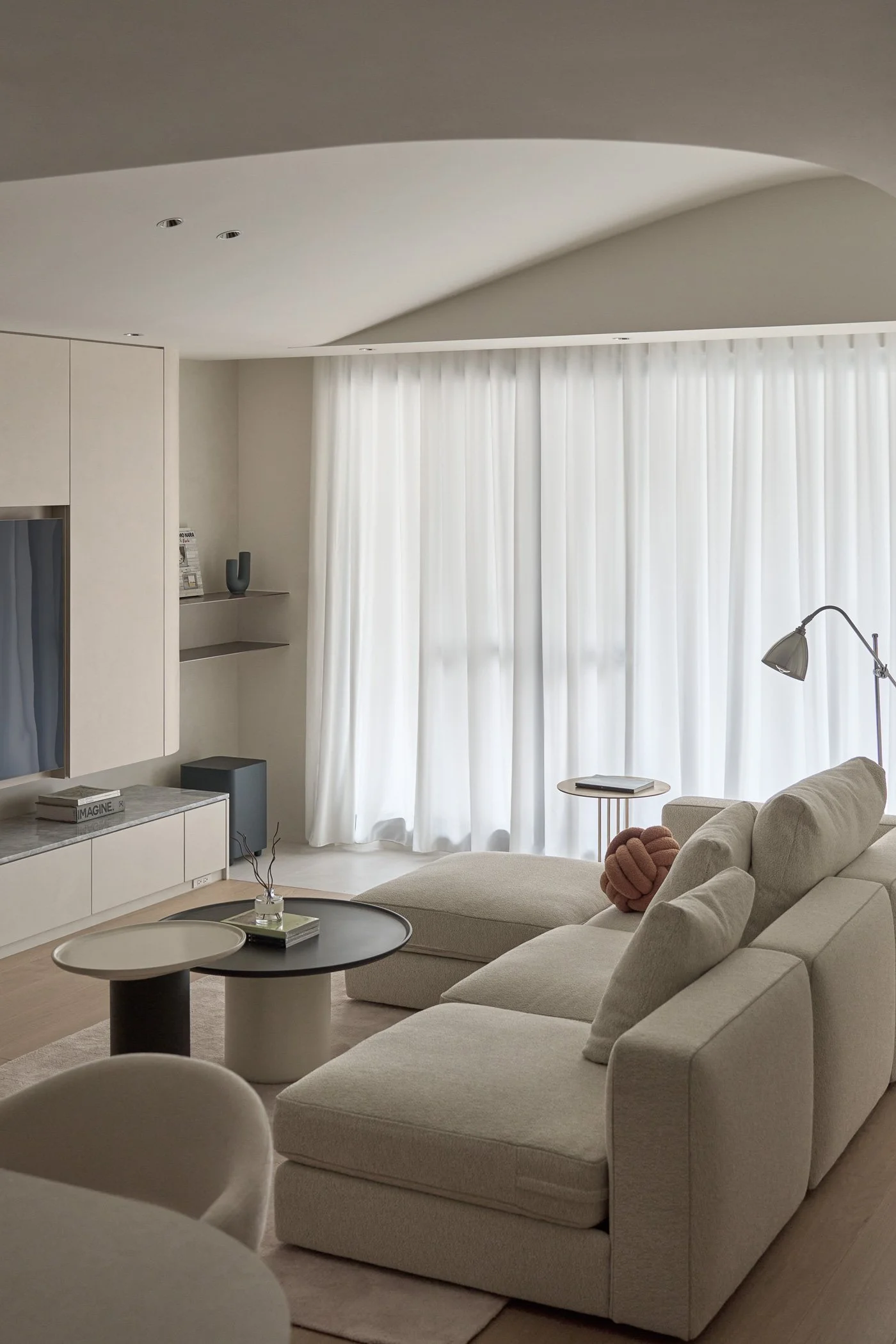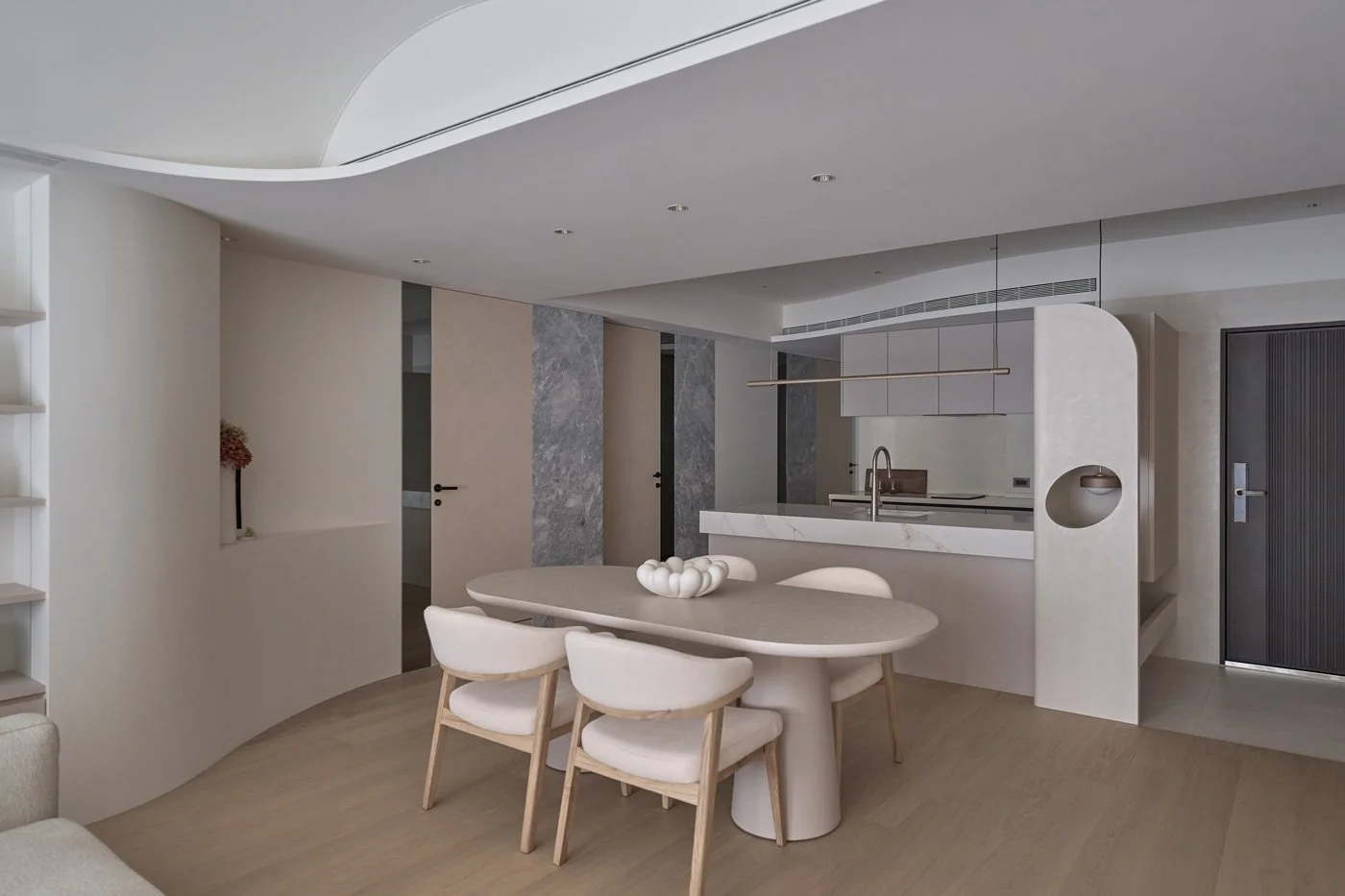 整體空間是由一連串的弧形結構組成,從玄關一路延伸至各領域,天花板、牆面、家具、轉角等,宛如摺紙般層層推進,沒有複製或對稱, 每一處都因應結構與動線鋪展。
