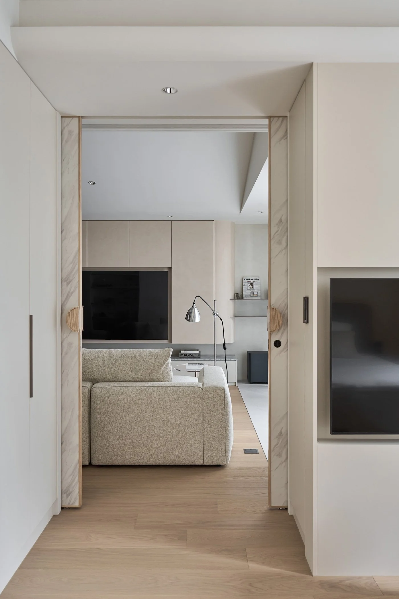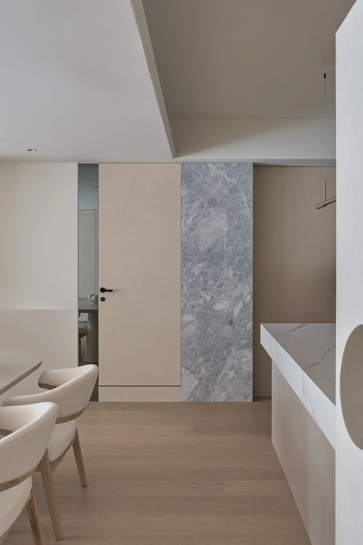 客廳與私領域之間的牆面看似一體,實則隱藏著客用衛浴與弟弟房的入口。設計團隊透過精密的材質分割與線性拼接,使門片在關閉時與牆面幾乎無界,維持整體的平衡與純粹。