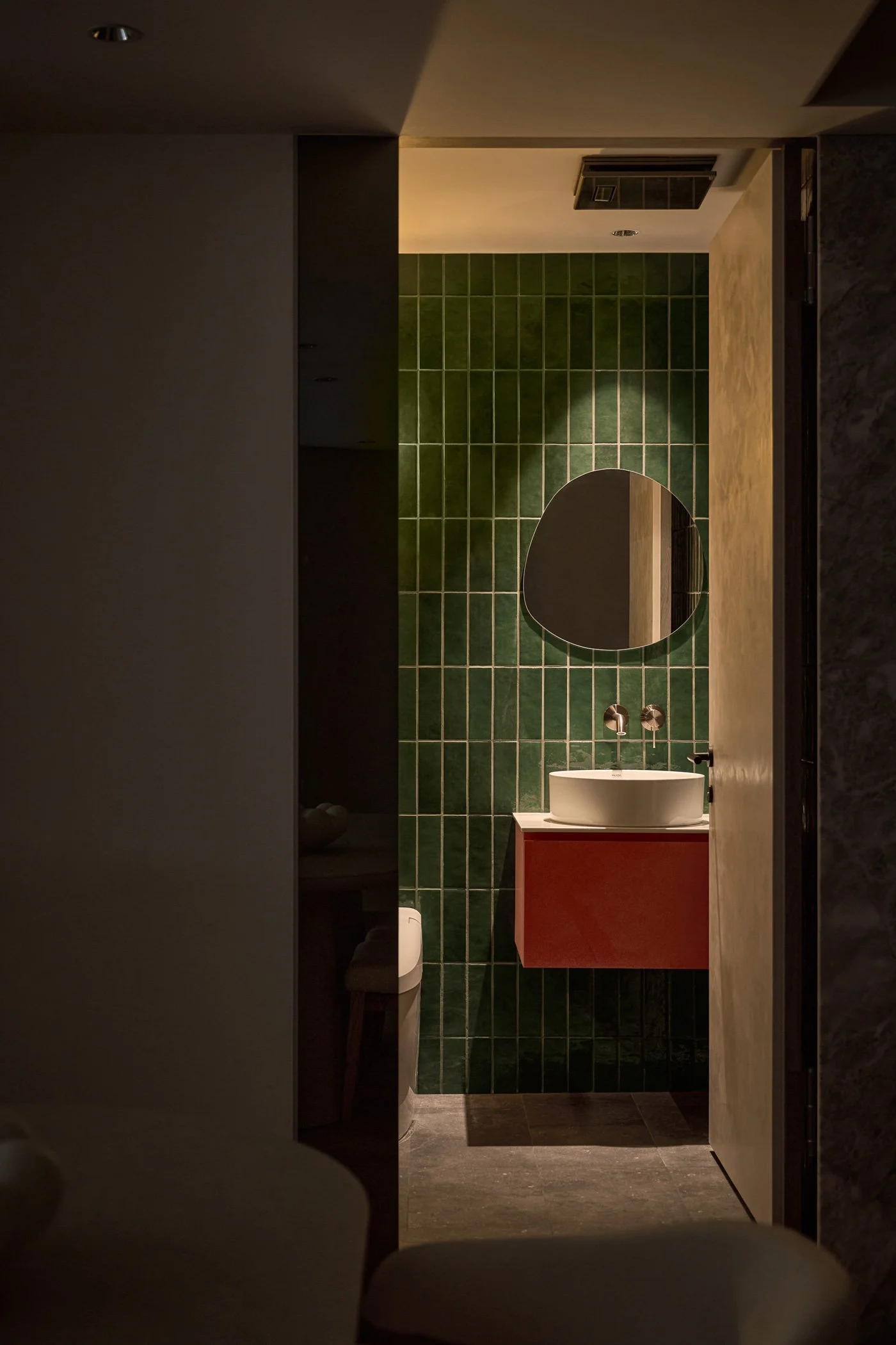 最戲劇性的一筆,藏在客用衛浴。深綠磁磚、古銅金屬與間接燈光交錯,彷彿走進充滿張力的精品酒店場景。光線內斂,氣氛沉靜,感官因此被拉進另一種維度