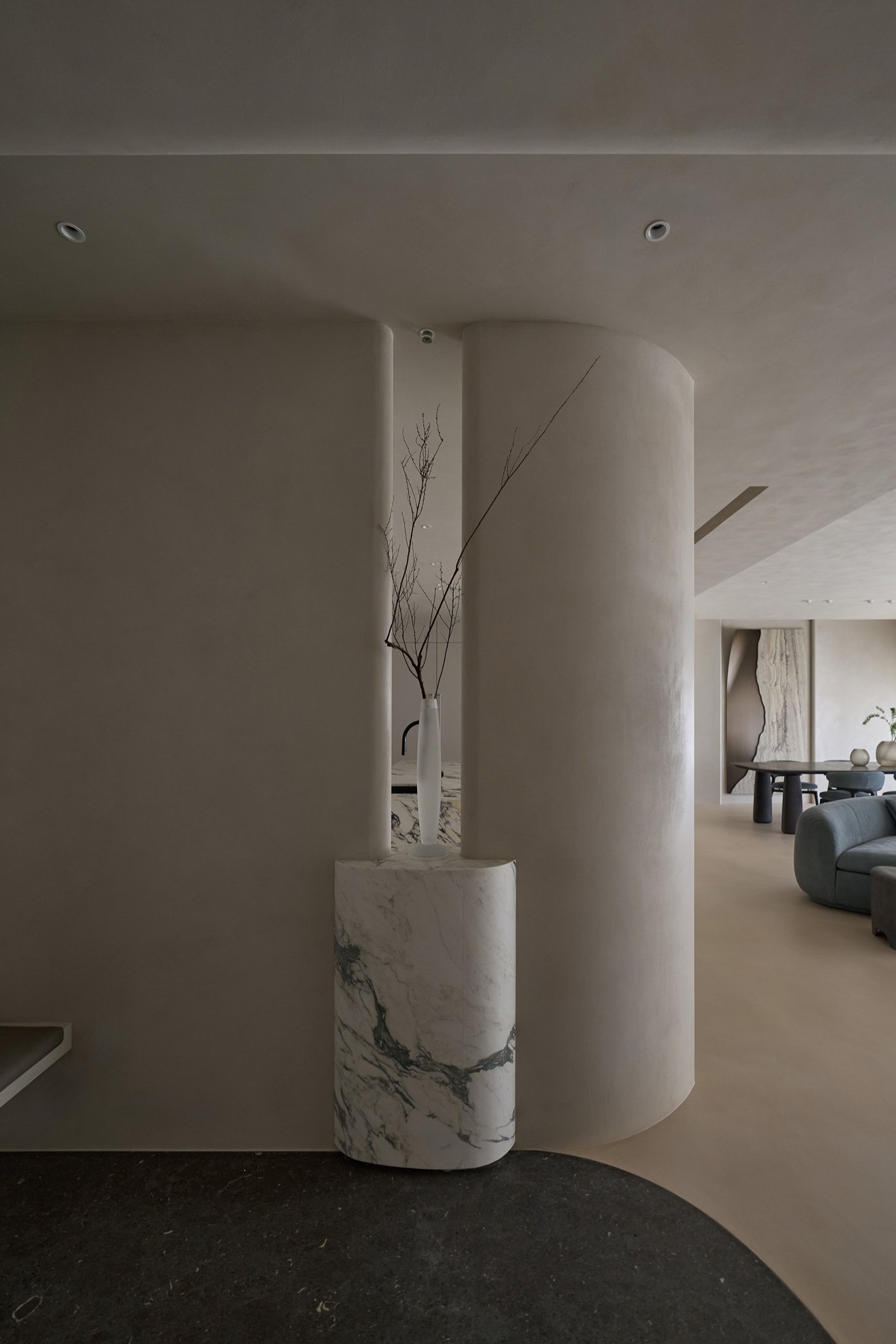 • Moving toward the private areas, another curved wall along the corridor echoes the gesture made at the entrance. It softens the view toward the bathroom door and the bedrooms beyond, slowing the pace of movement and settling the mind as one transitions deeper into the home.