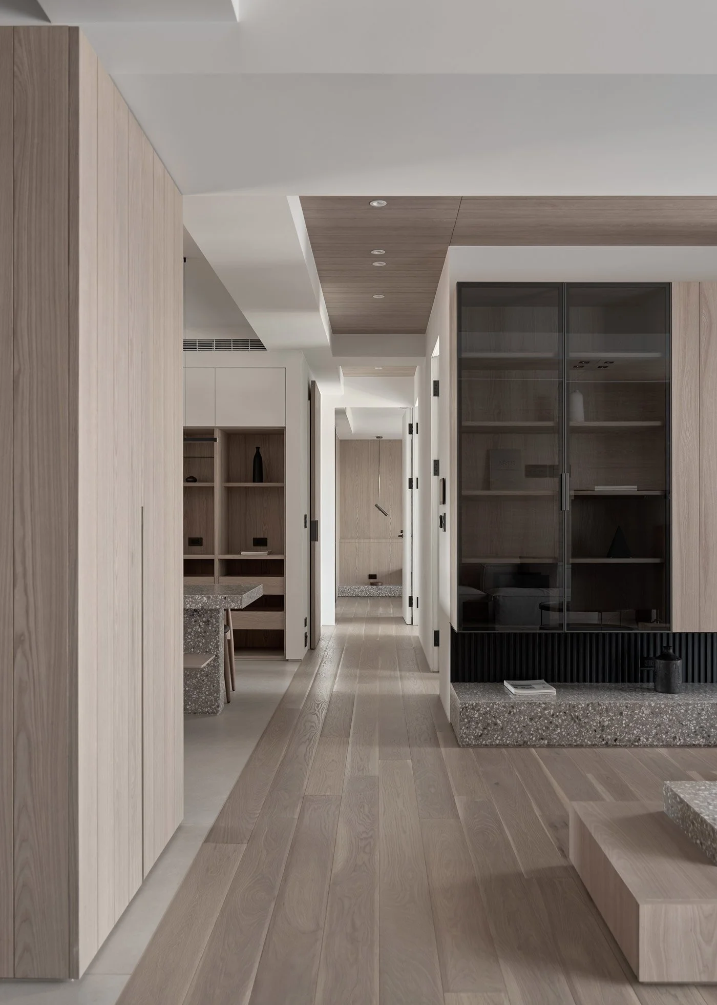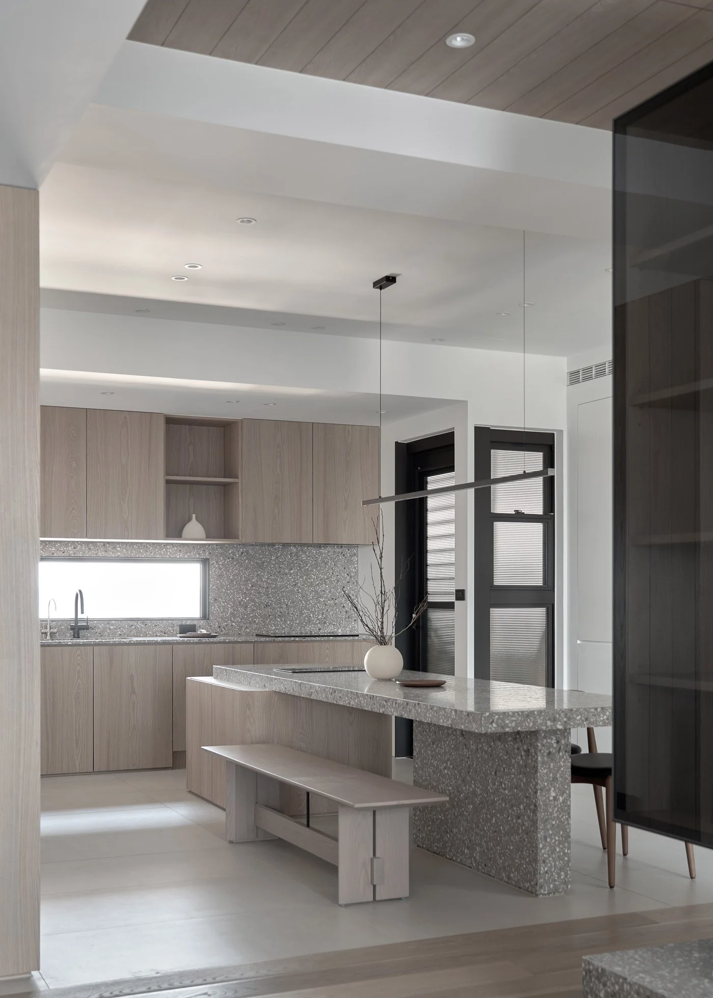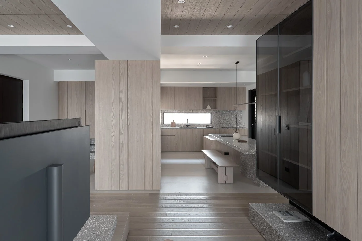 To enrich the spatial texture, the designers introduced terrazzo in soft grey and white tones as an accent. Its scattered mineral fragments catch the light with a quiet shimmer, adding a subtle elegance to countertops and shelving. Slim metal elements are also integrated in key areas, striking a gentle balance between the softness of wood and the grounded weight of stone.