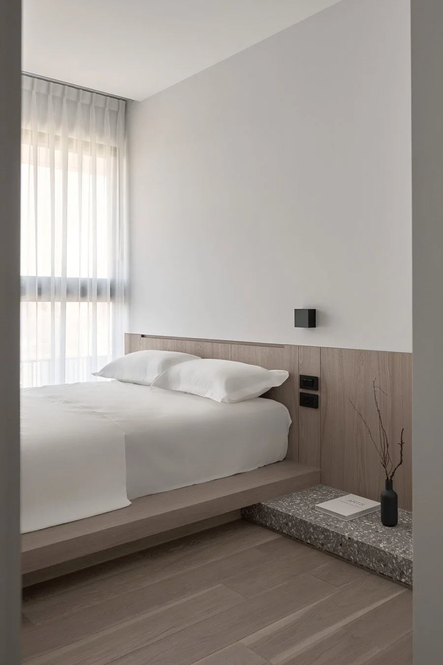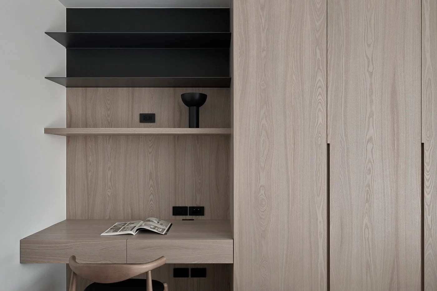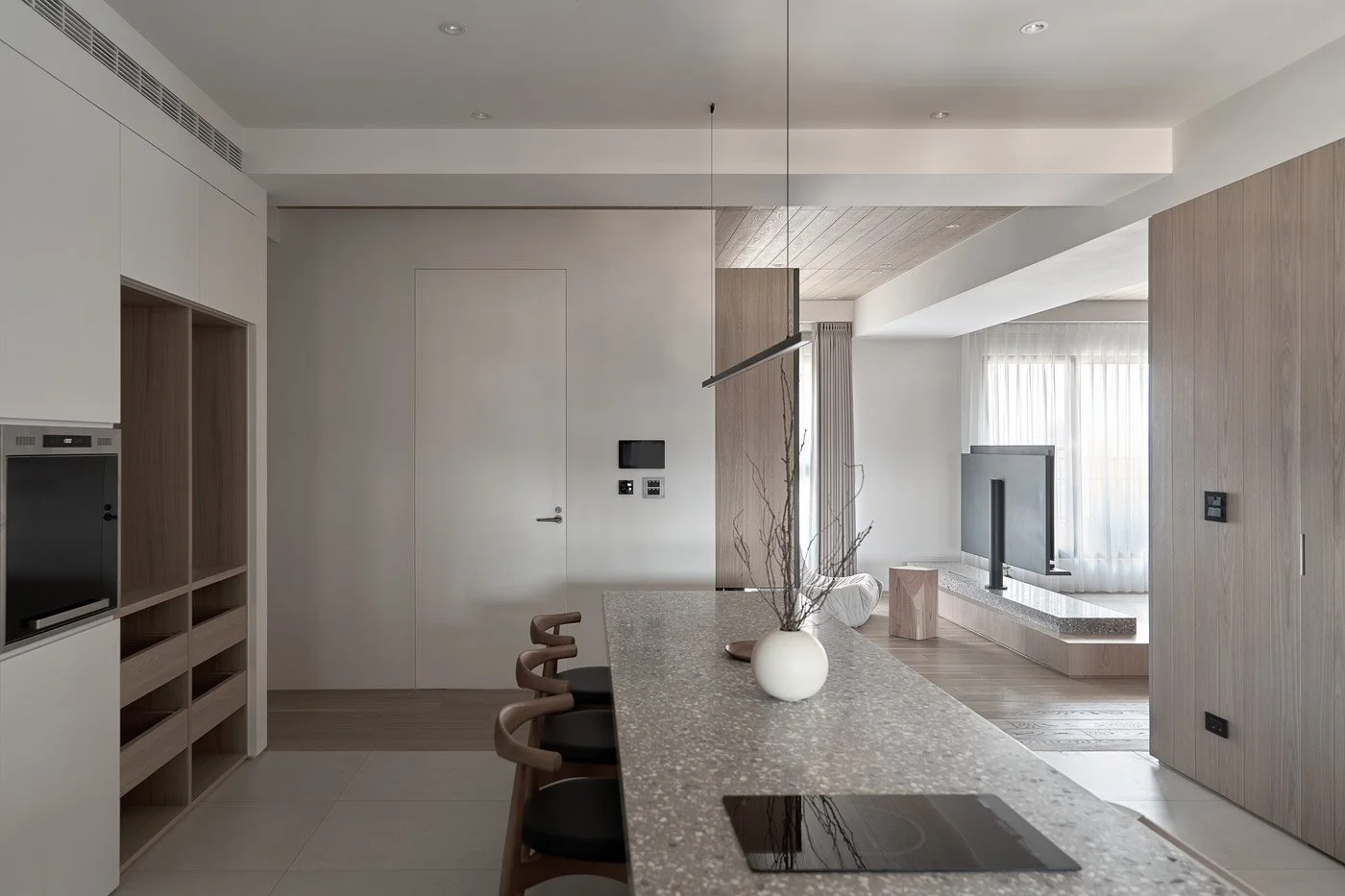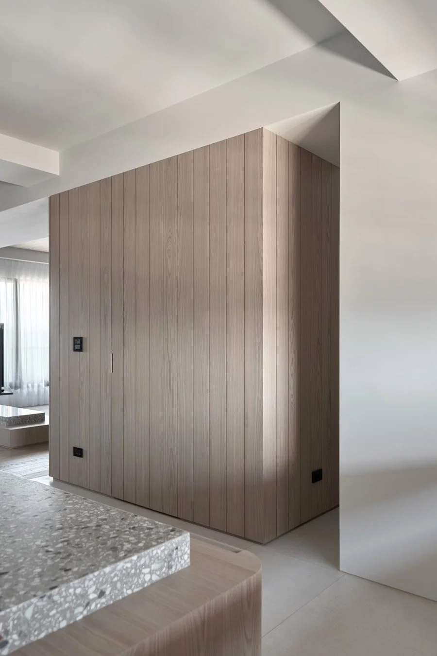 To enrich the spatial texture, the designers introduced terrazzo in soft grey and white tones as an accent. Its scattered mineral fragments catch the light with a quiet shimmer, adding a subtle elegance to countertops and shelving. Slim metal elements are also integrated in key areas, striking a gentle balance between the softness of wood and the grounded weight of stone.