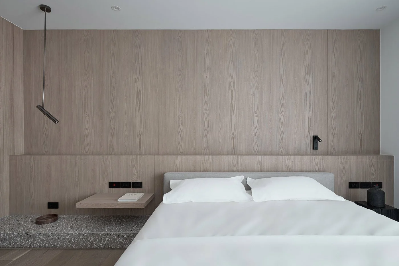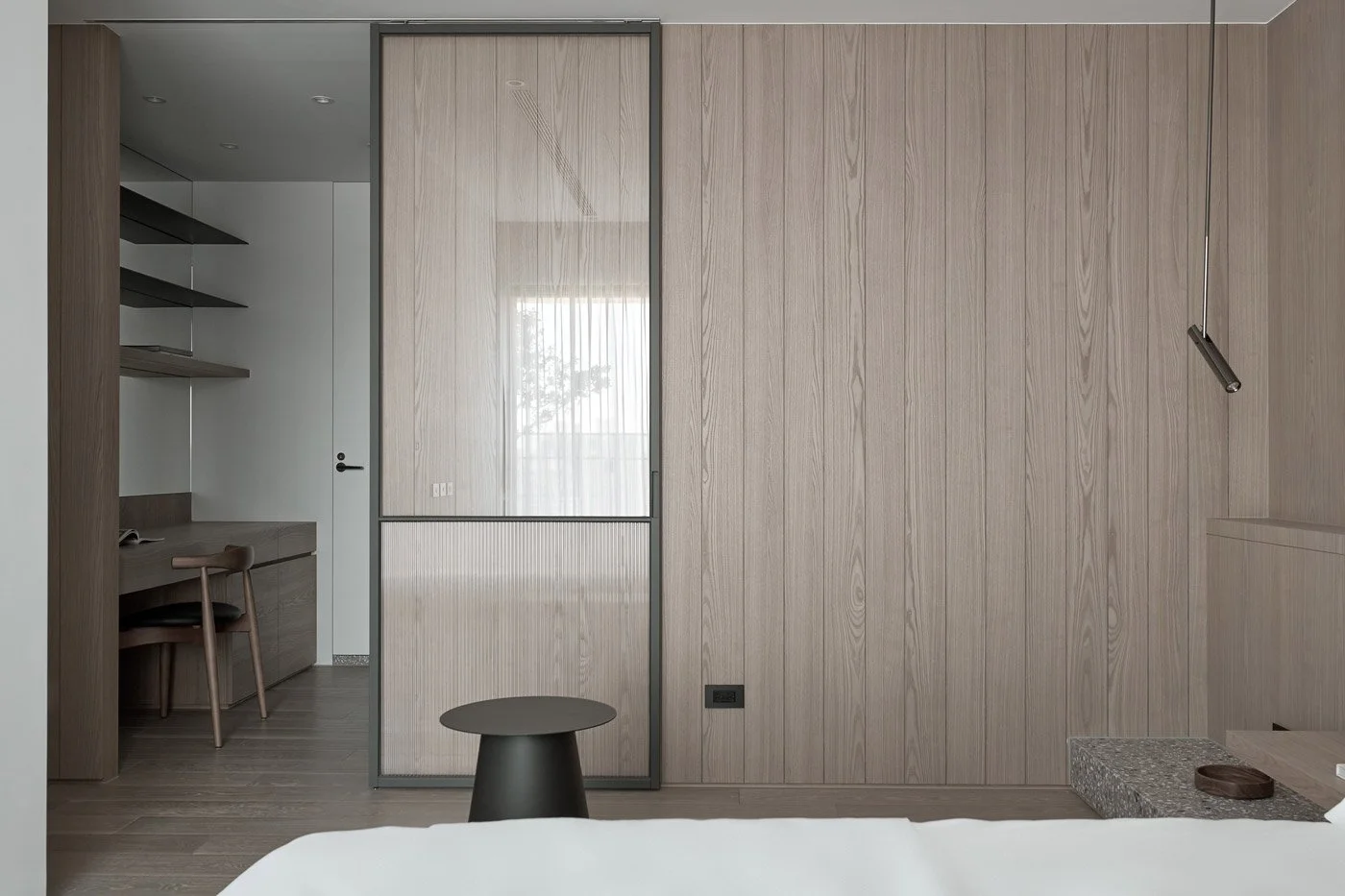 By day, sunlight filters in to highlight the wood veneer that extends from wall to ceiling, bringing out its warm texture and depth. By night, soft lighting washes across white walls and timber tones, creating a sense of quiet belonging where the family can unwind.