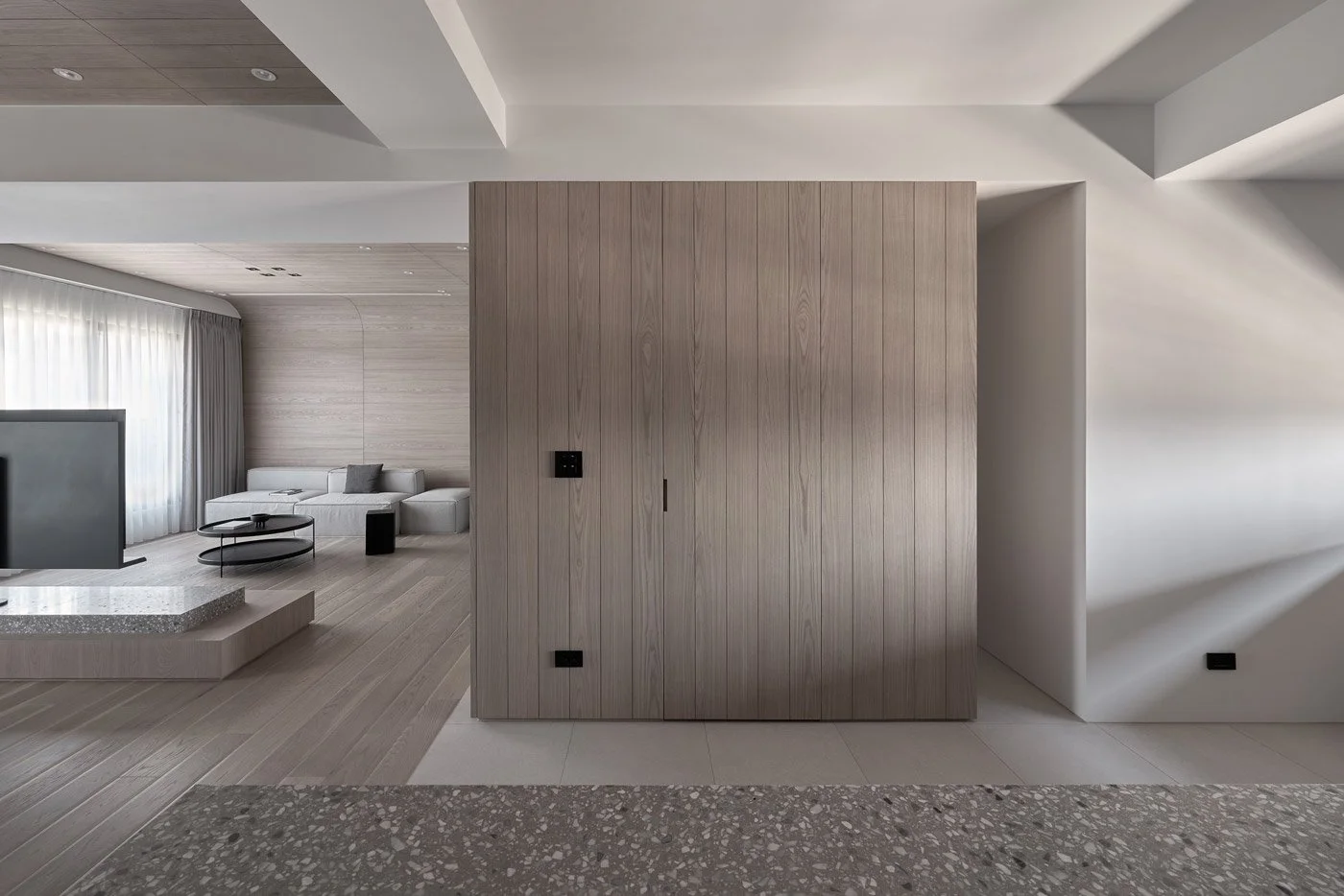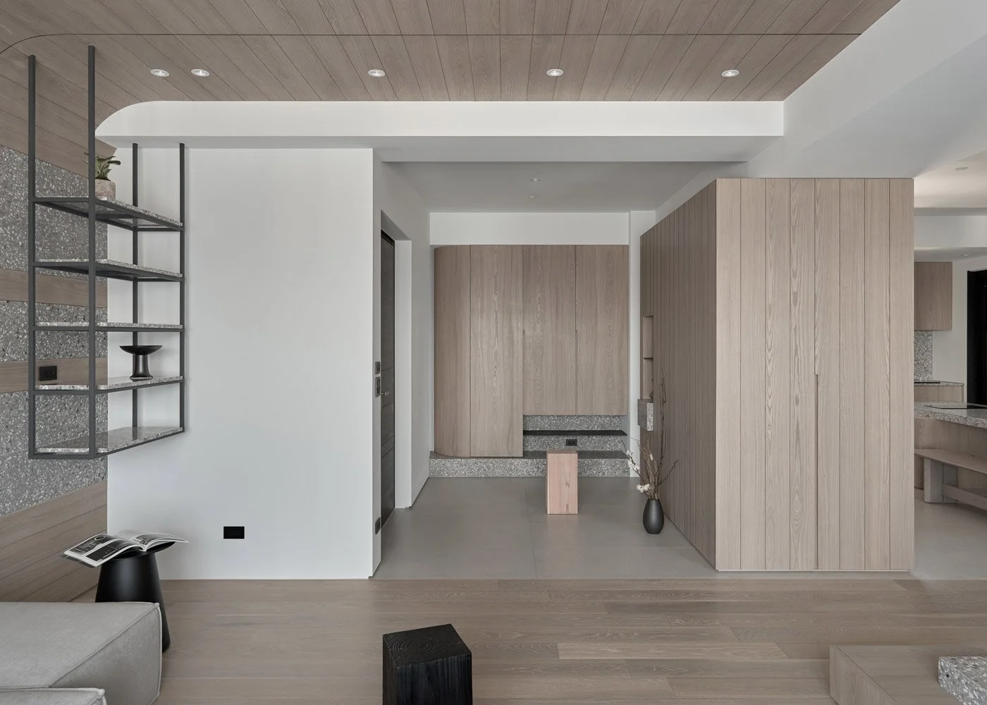 • Within the open-plan interior, the design still leaves room for a quiet surprise. Between the entryway and dining area, what appears to be a decorative wall volume is, in fact, a concealed storage room.