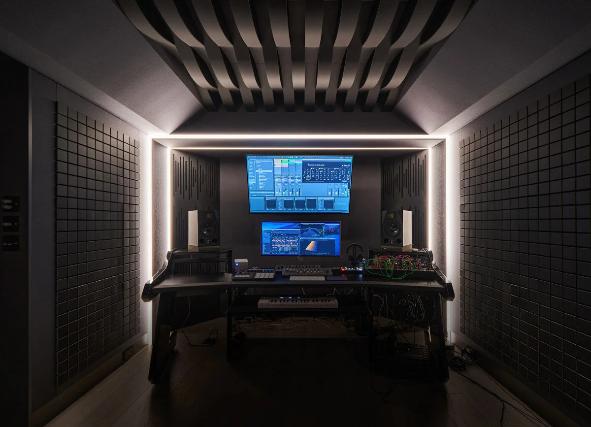 在與音樂工作為業的屋主溝通過程中,了解其生活型態不被晝夜時序所限,唯有靈感才能掌控靈魂的航道,進而將灰調的紋理包覆空間,輔以金屬與長型燈光交織而成的科幻感,同時因應收音需求規劃置中格局阻隔對外窗,工作室的位置就如同地核般成為孕育能量的場域,需要近乎苛求的靜,以呵護著每次敲擊與聲響,拼接起一絲一縷的創作元素。