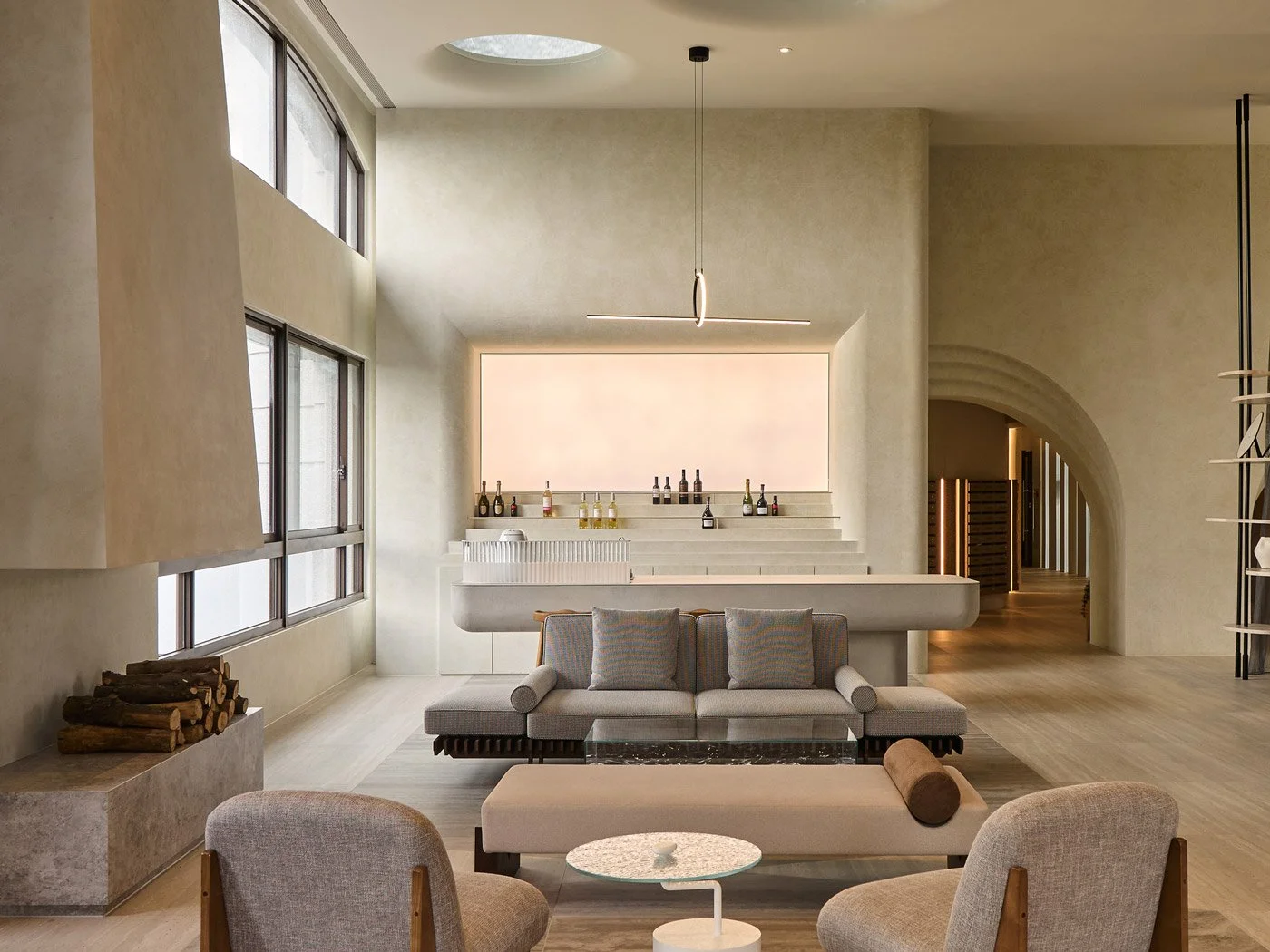 公共區域的結構柱原本龐然突兀地立於中央,設計團隊運用內凹弧面加以修飾,使其轉化為壁爐般的存在,消弭其壓迫感,也為沉靜純粹的空間挹注溫暖氣息。整體空間中最具戲劇性的核心,莫過於吧檯交誼區。弧形吧檯猶如船底,承載著人們的交流與情感;其後方的階梯與光膜照明層層堆疊,宛若引導人走向一處神聖的境地。天花板的燈具則以水波燈光模擬,讓光影如真實的水波紋般折射,營造出湖畔夜晚的靜謐幻象。當人們落座於吧檯,微光在空間中輕輕漾開,營造出既親密又帶著儀式感的氛圍。