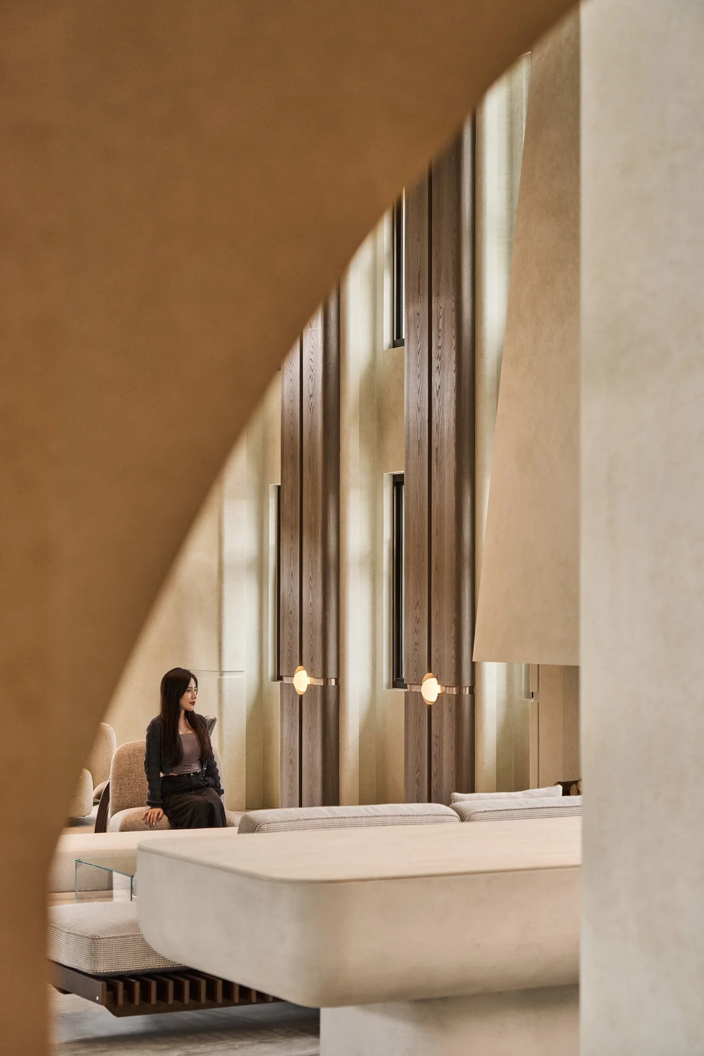 穿過由小片磁磚錯落堆砌視覺展示牆,宛如河岸邊被細膩抽象化的石頭,留下凹凸有致的韻律。牆體弧線結構設計,不僅消弭了空間的銳利感,更為大廳增添圓潤與親近的氛圍,降低過於冰冷的距離感。