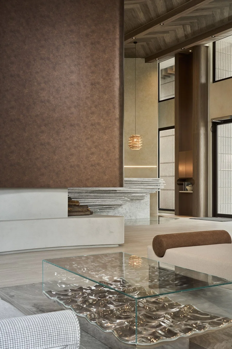 • The design draws from the language of the lake, holding stillness while reflecting a quiet longing beneath the surface of daily life. Stone suggests presence. Wood grain carries breath. Light and shadow trace the passage of time. Through these elements, the lobby becomes a soft resting point within the everyday. Guests and residents pause at the reception like stones held gently by water. At the bar, layered lighting shimmers like stars reflected on the lake. In the screening room, the cave-like enclosure gathers the mind inward and still.