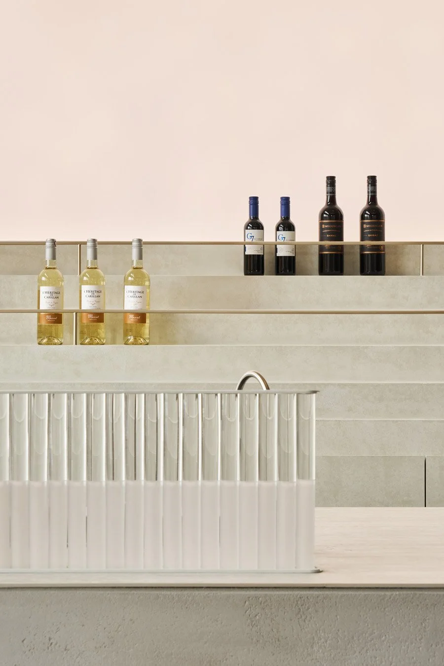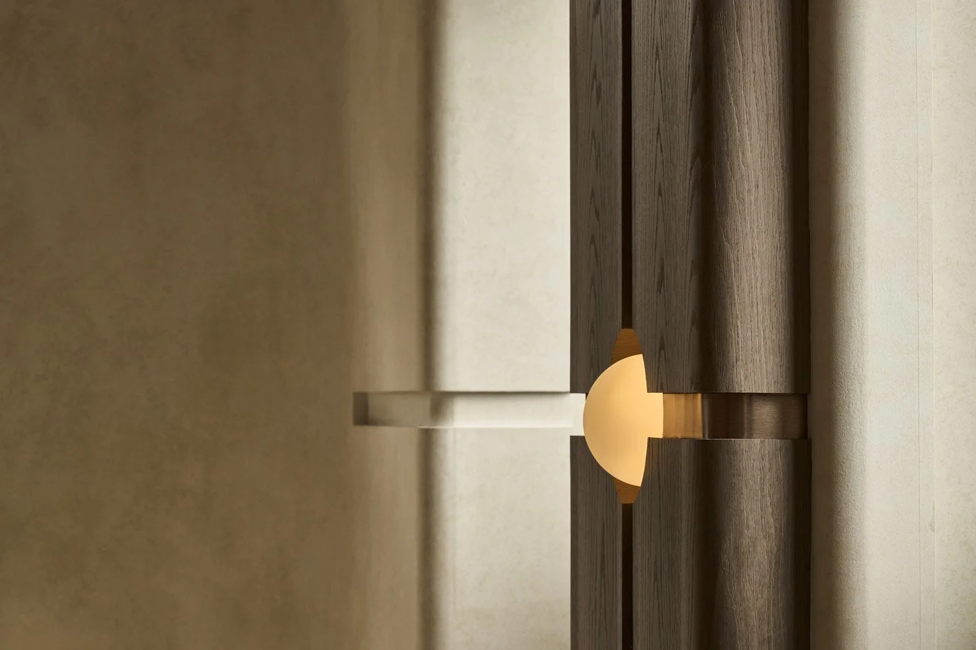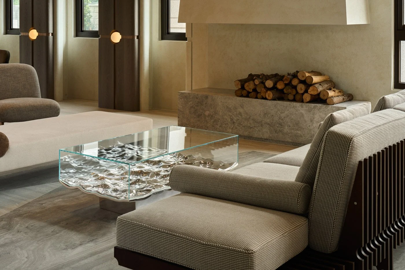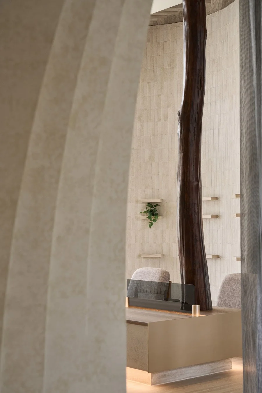 At the heart of the entrance, the reception counter anchors the space with quiet strength. Built from hand-laid marble slabs, it recalls the raw texture of boulders found in a mountain stream. Both rugged and refined, the piece evokes a stone resting in water. It offers a sense of stillness and a quiet invitation to pause.