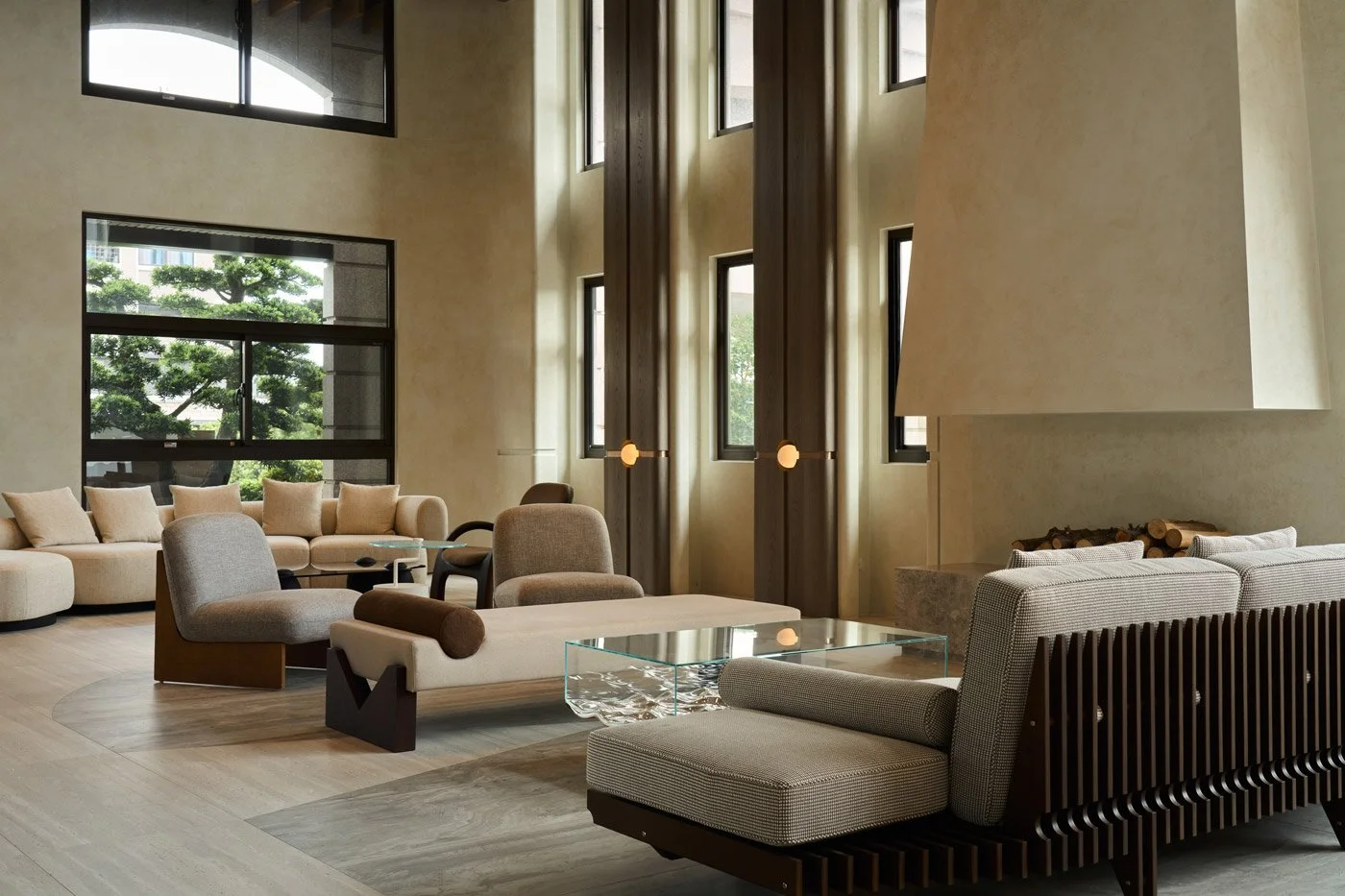 大廳採開放式格局,以地坪與家具配置巧妙劃分界線。吧檯區地面鋪設灰、米色相間的磁磚,如同地毯般鋪展,暗示交流場域;沙發與閱讀區則可隨意轉向,或面向落地窗引入景觀,或融入吧檯氛圍,讓場域既保有彈性,又帶有曖昧的親密感。