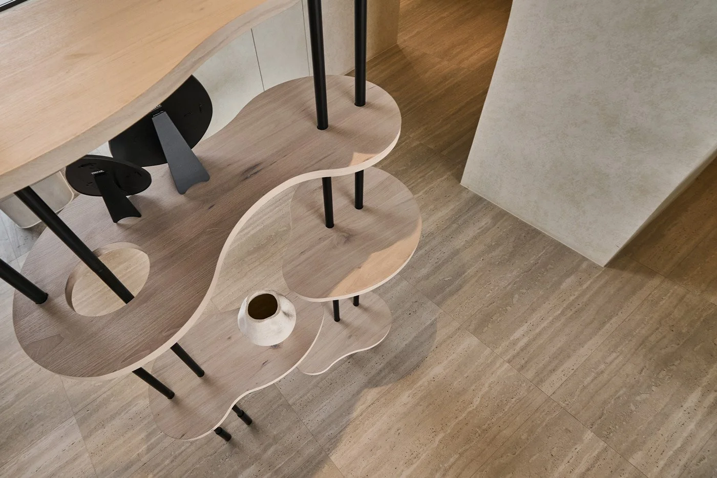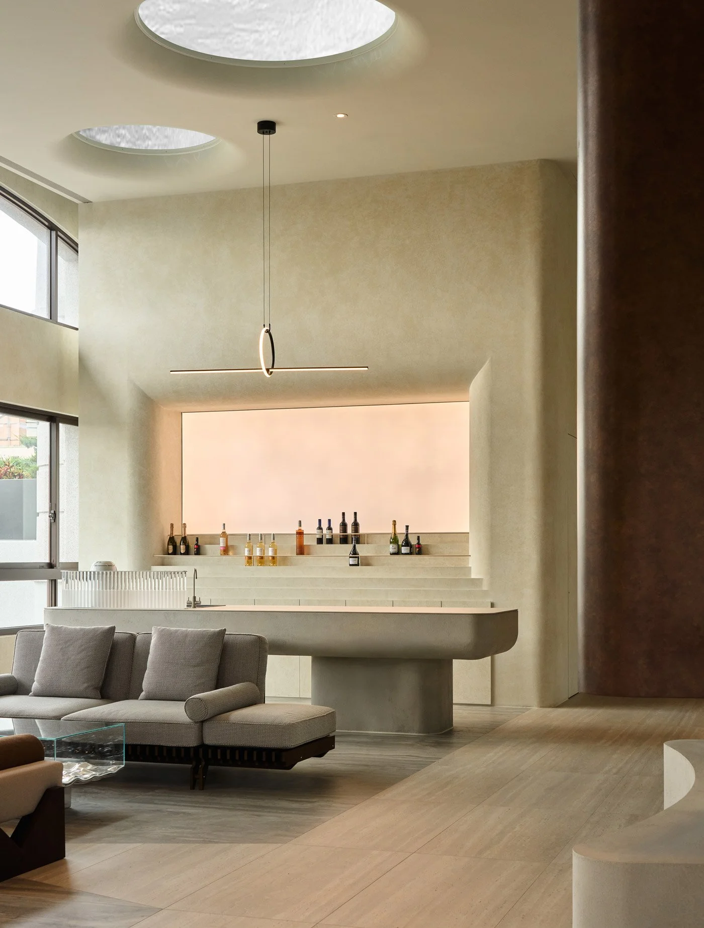 A large structural column once stood awkwardly in the center of the communal area. The design team softened its presence by carving a recessed curve into its form, transforming it into a fireplace-like feature. This intervention eased its visual weight while introducing warmth into the otherwise restrained space.
