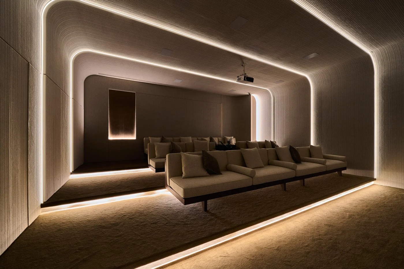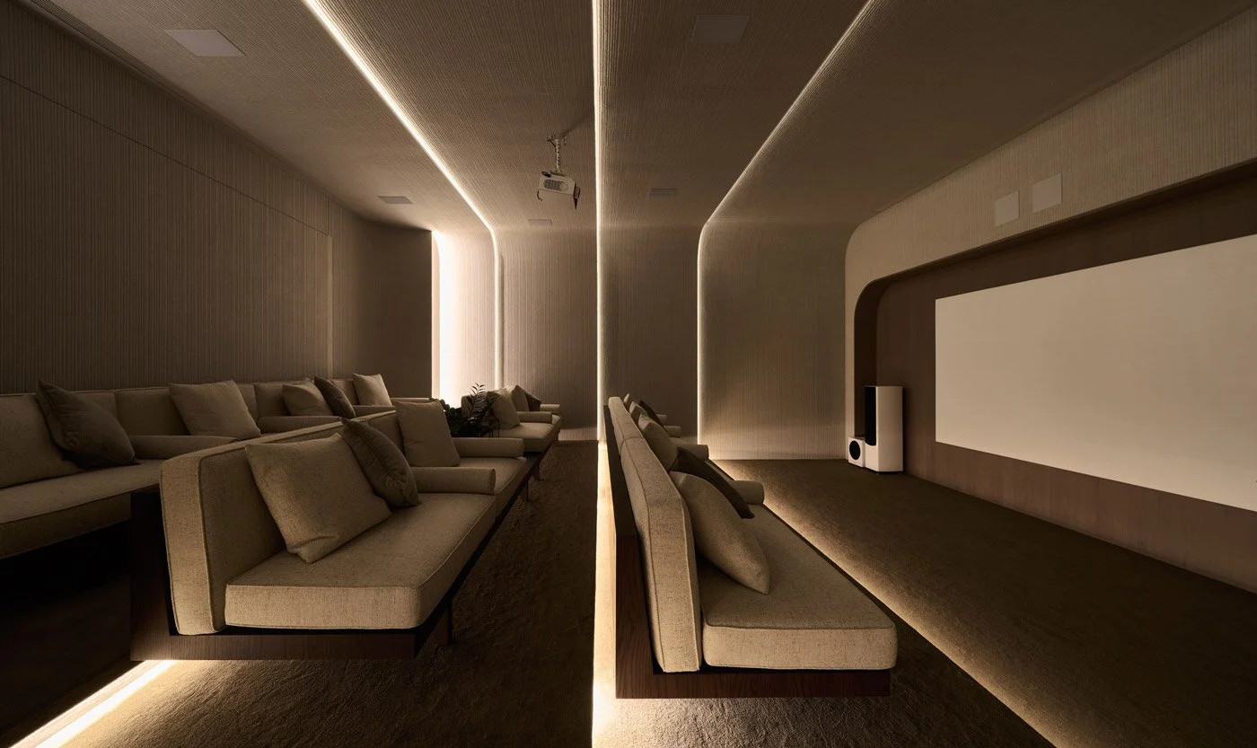 • Inside the enclosed screening room, the atmosphere shifts. A curved ceiling and wooden acoustic panels create a cocoon-like enclosure, pulling visitors into a space of calm and focus. The walls resemble stone shaped by water, while dimmed lighting and circular LED strips add a quiet technological clarity. The result is an immersive setting designed entirely for film viewing.