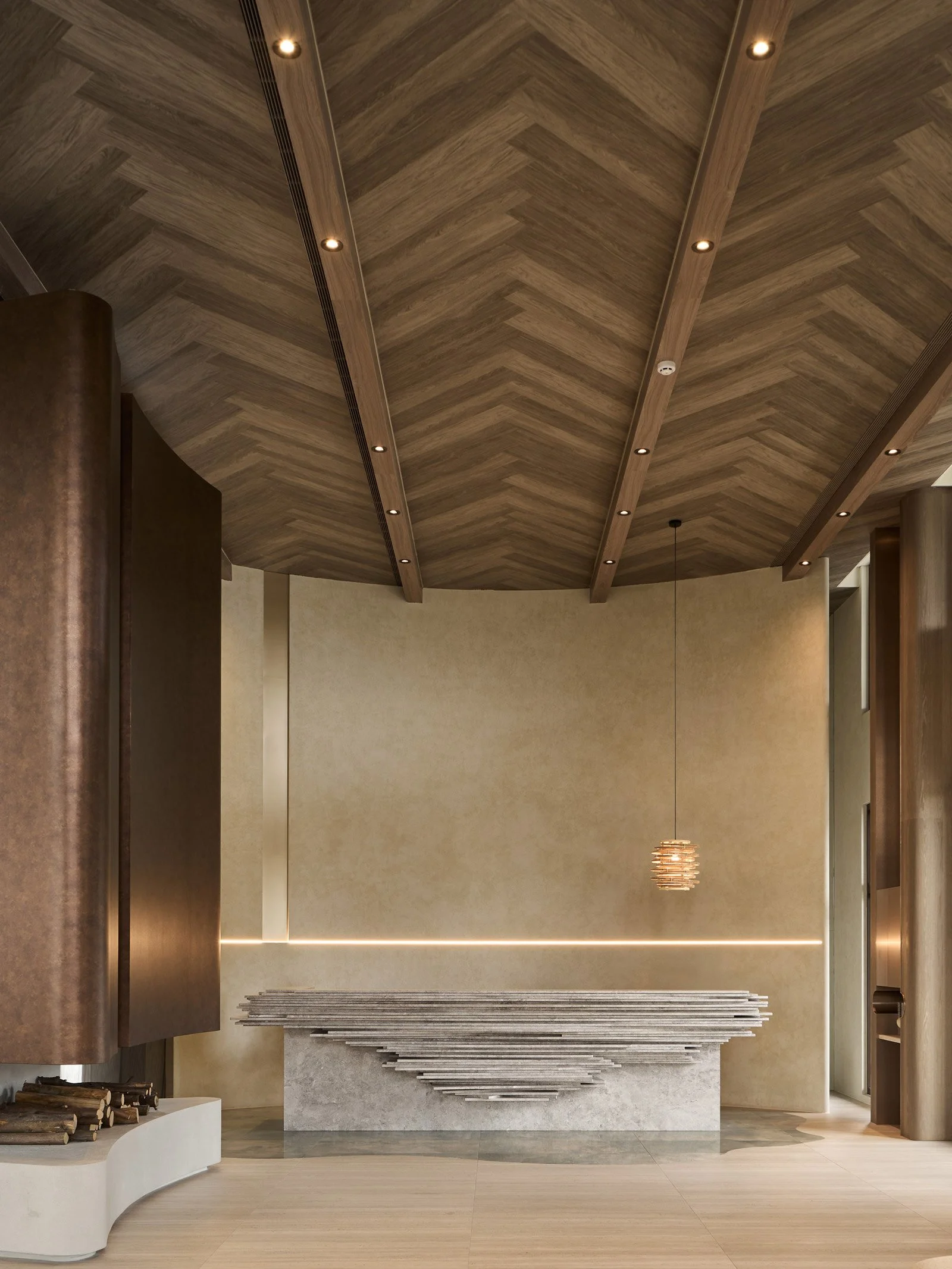 入口正前方的接待櫃台,構築大廳最鮮明的印象。設計團隊特別選用大理石逐片堆砌,細膩工藝還原了溪谷巨石般的原始質感,粗獷中蘊含細膩,猶如「湖中的石塊」,既象徵安定,也暗示停駐。